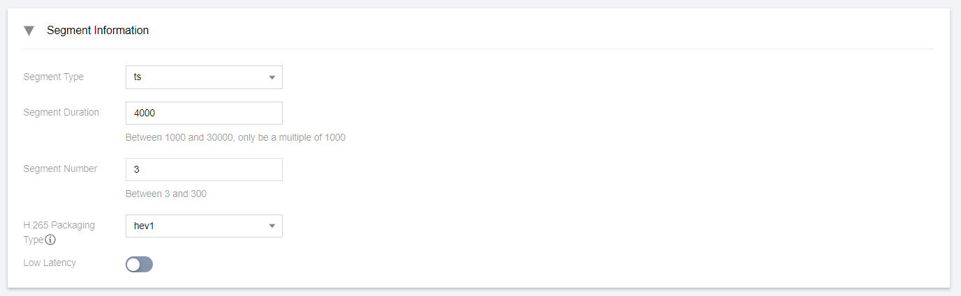 You can also specify the Segment Information on this page, including the segment type, segment duration, and segment number. For some devices, such as Apple TV, to play H.265-encoded videos, you need to select fmp4 as the Segment Type and hvc1 as the Packaging Type.