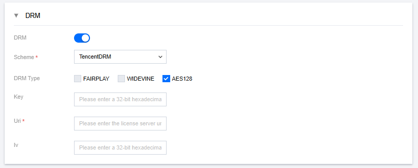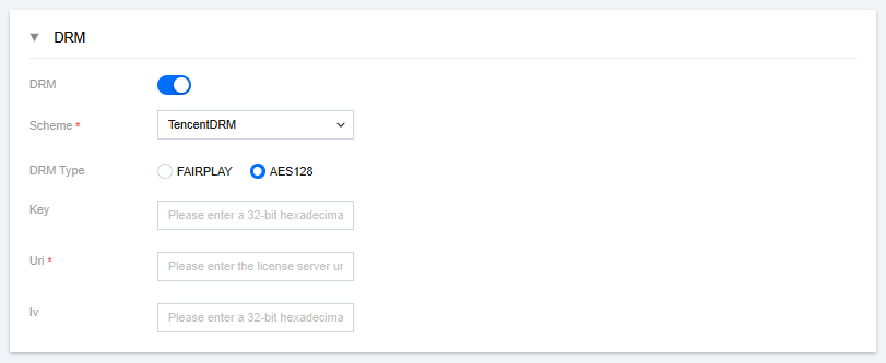 2. For the HLS protocol with fmp4 segments: DRM Type can support FAIRPLAY, WIDEVINE, PLAYREADY, and AES128. Multiple selections are supported, but AES128 is mutually exclusive with the other three types.
