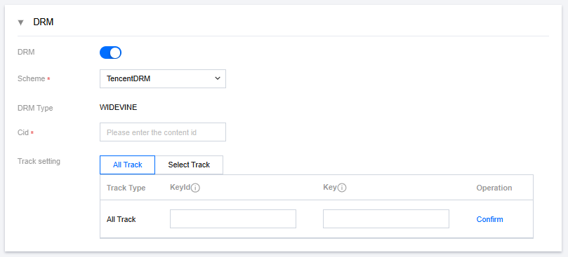 If your DRM system does not provide keys for different tracks, select All Track. If your DRM system provide keys for different tracks, you can configure a separate key ID and key for each track (five track types are supported: AUDIO, SD, HD, UHD1, and UHD2 ).