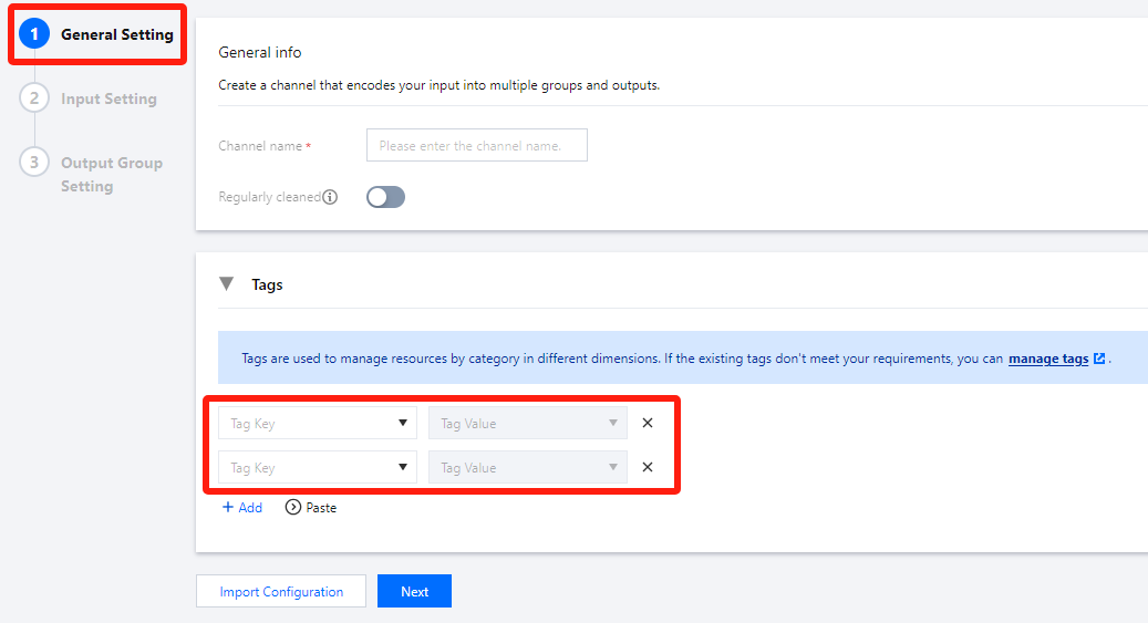 2. When creating a StreamLive channel, you can add tags in General Setting.