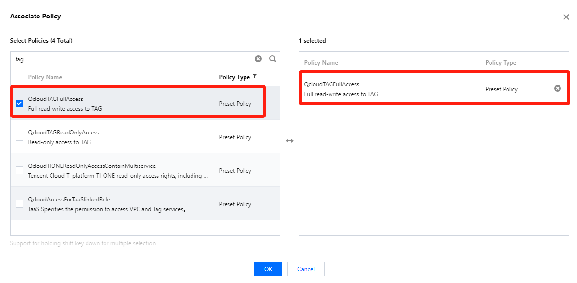 3. Then add the policy QcloudTAGFullAccess to MDL_QCSRole, in order to grant StreamLive the read and operation permissions on tag data.