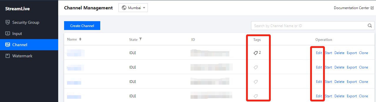 3. After creating the channel, you can view Tags in the channel List. If you need to edit tags, click Edit to enter the Channel Edit Page.