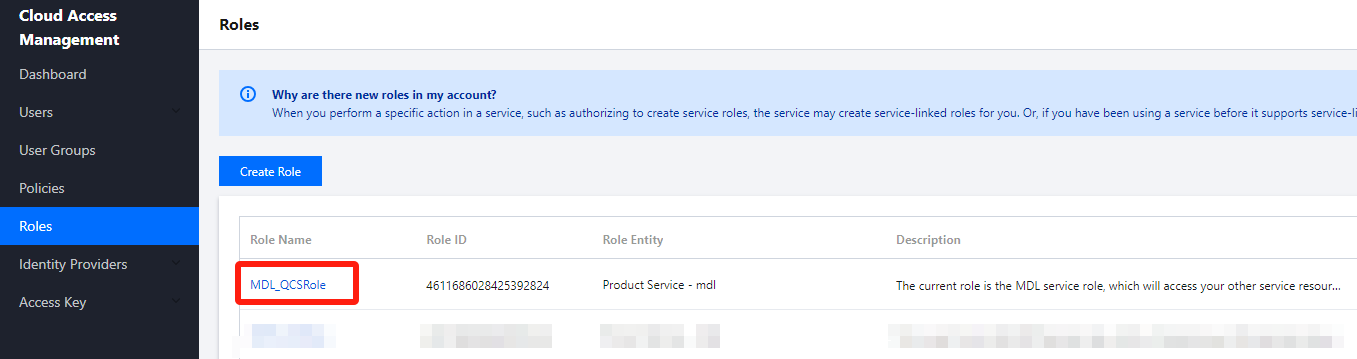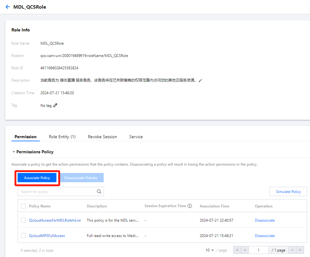 1. In Tencent Cloud Access Management, select Roles, and find the StreamLive service role MDL_QCSRole in the page. 2. Enter the details page for MDL_QCSRole, and click Associate Policy.