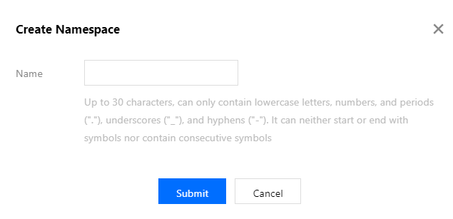 3. In the Create Namespace window that appears, enter the namespace name and click Submit, as shown in the figure below.