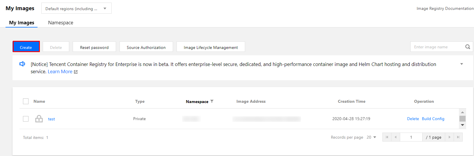 1. Select Image Repository > My Images in the left sidebar to go to the My Images page. 2. On the "My Images" page, click Create above the image list, as shown in the figure below.