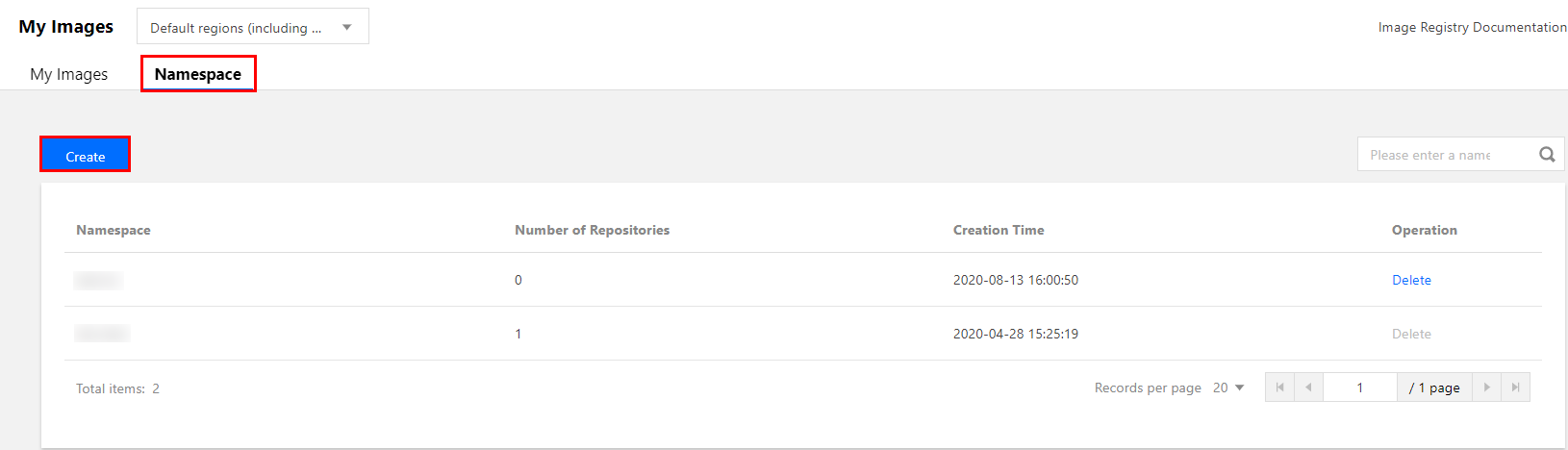 1. Choose Image Registry > My Images in the left sidebar to go to the "My Images" page. 2. On the "My Images" page, select the Namespace tab and click Create, as shown in the figure below.