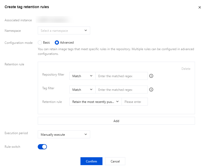 Execution cycle: Execution cycle of the version retention rules. The tag retention rules can be manually executed or automatically executed on a daily, weekly, or monthly basis. The specific execution time is as follows: 00:00 on each day, 00:00 on each Monday, or 00:00 on the first day of each month.