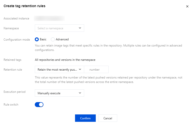Retention rule: Two modes are supported: Retain the most recently pushed # tags, or Retain tags pushed within the last # days. The number of tags or days needs to be specified.