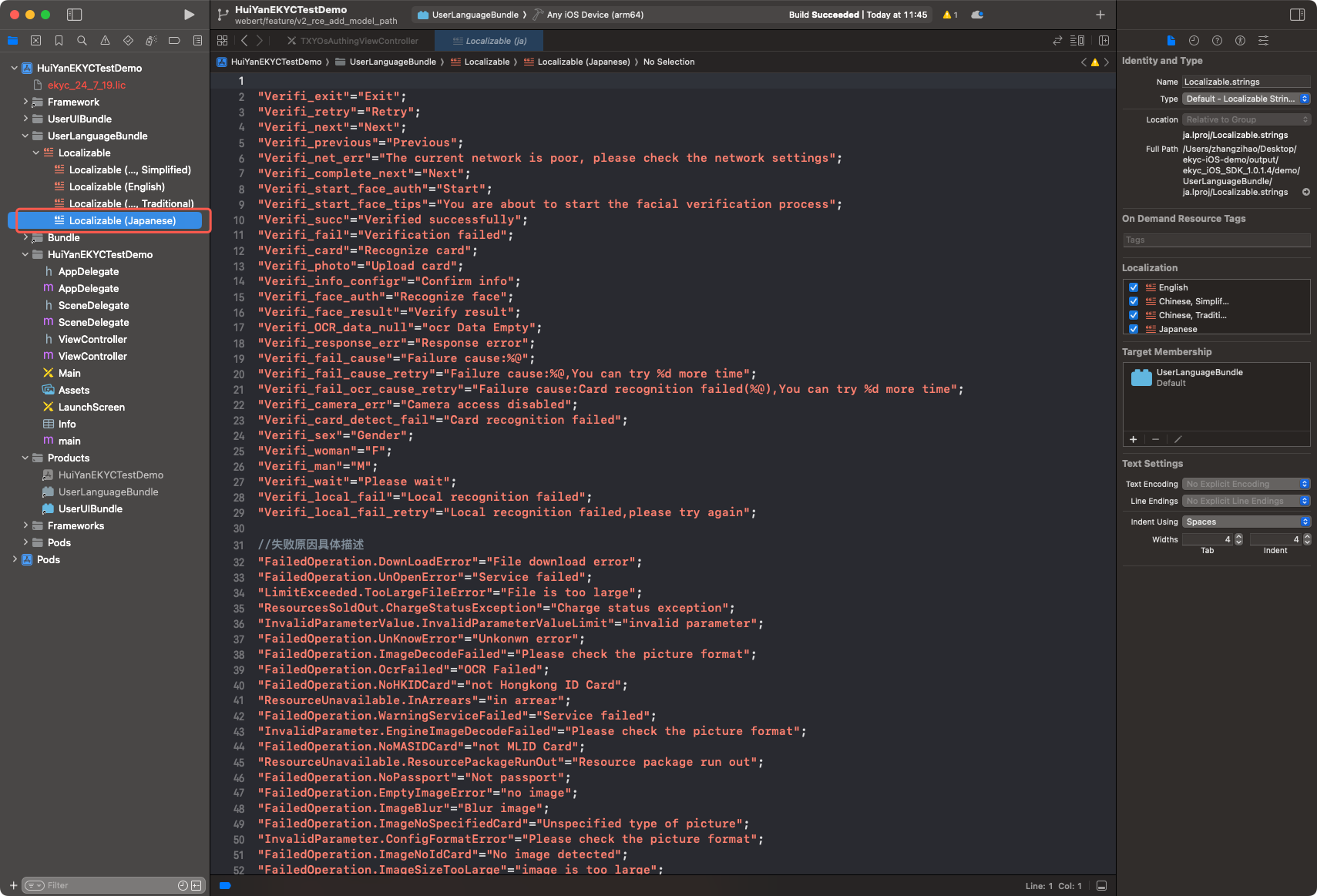 demo/UserUIBundle/ to the code repository of the host project as the source code directory for custom UI after custom modifications are made. All subsequent modifications will be based on this directory.VerificationConfig *config = [[VerificationConfig alloc] init];config.licPath = @"/path/to/license.lic";config.ekycToken = @"your-ekyc-token";// --- Custom UI ---config.userUIBundlePath = [[NSBundle mainBundle] pathForResource:@"UserUIBundle" ofType:@"bundle"];config.delegate = self; // Optional: Implement VerificationDelegate to listen to UI events// Code-level style fine-tuning (Optional; use when you don't need to modify XIB files)config.ocrCustomConfig.rectNormalColor = [UIColor colorWithWhite:1.0 alpha:0.8];config.faceCustomConfig.backgroundColor = [UIColor colorWithRed:0.1 green:0.1 blue:0.1 alpha:1.0];// --- Custom Multilingual ---config.languageType = HY_EKYC_CUSTOMIZE_LANGUAGE;config.userLanguageBundlePath = [[NSBundle mainBundle] pathForResource:@"UserLanguageBundle" ofType:@"bundle"];config.userLanguageFileName = @"ja.lproj";// Start verificationVerificationKit *kit = [[VerificationKit alloc] init];[kit initWithViewController:self];[kit startVerifiWithConfig:config withSuccCallback:^(int errorCode, id resultInfo, id reserved) {// Verification successful} withFialCallback:^(int errorCode, NSString *errorMsg, id reserved) {// Verification failed. Error code 311 indicates an exception in the Bundle path configuration.}];