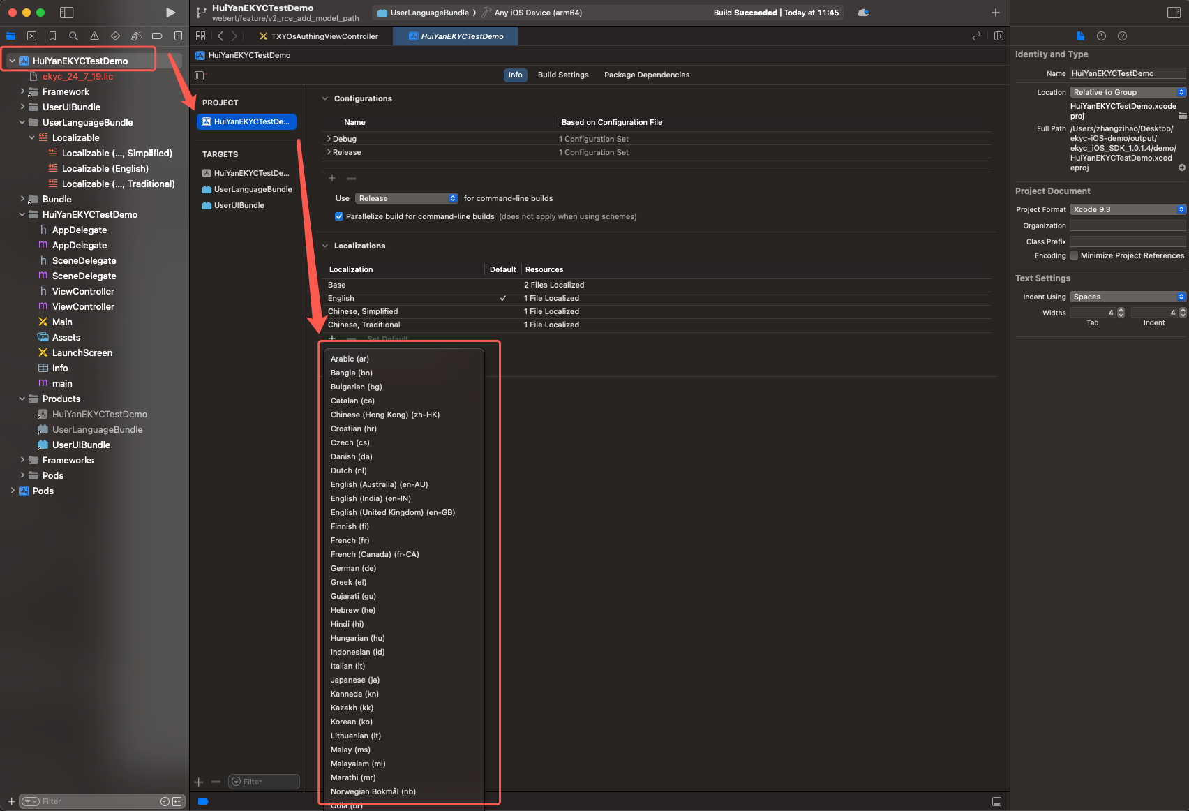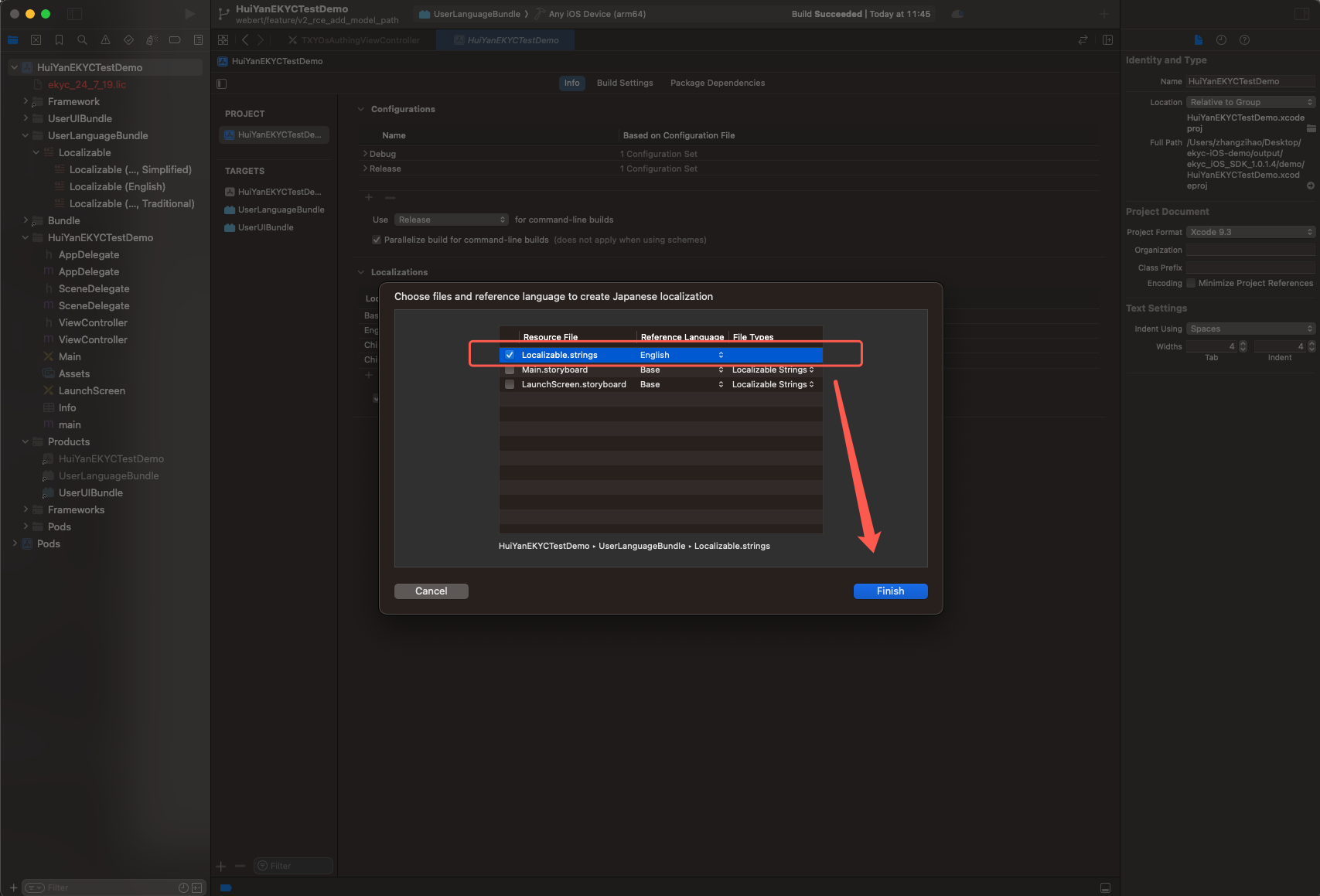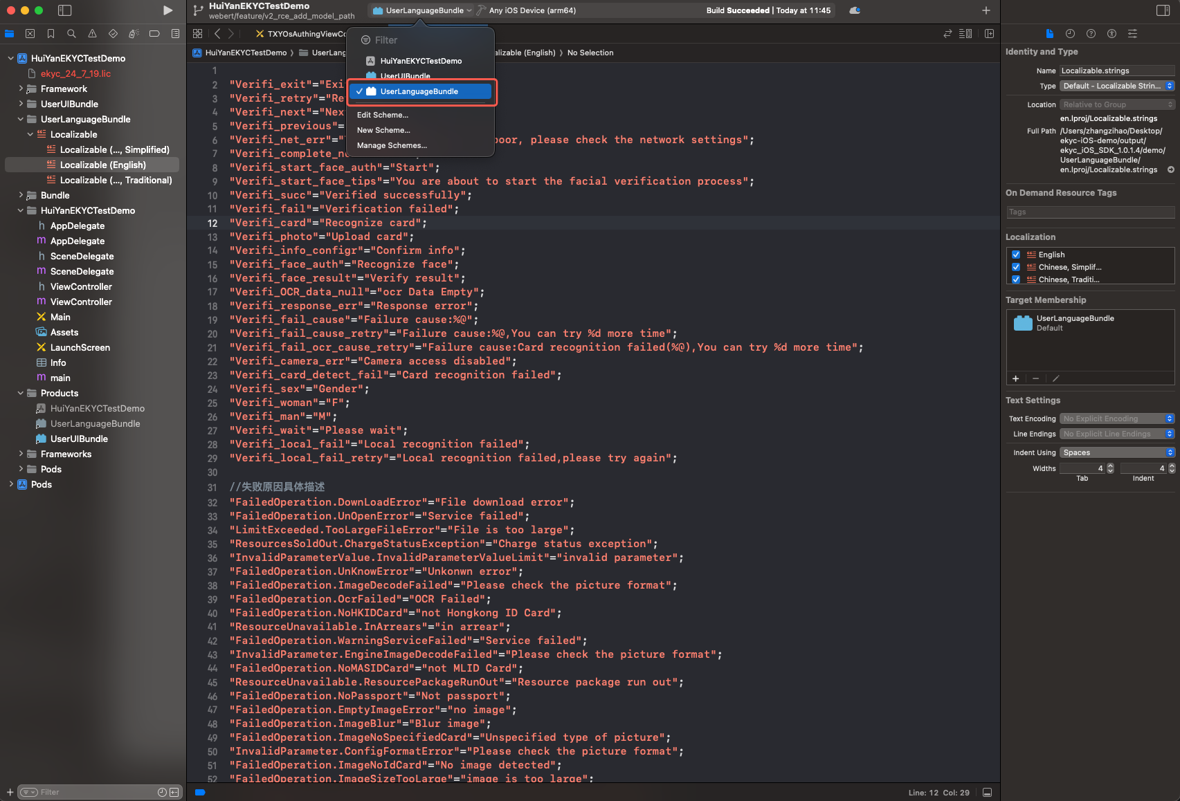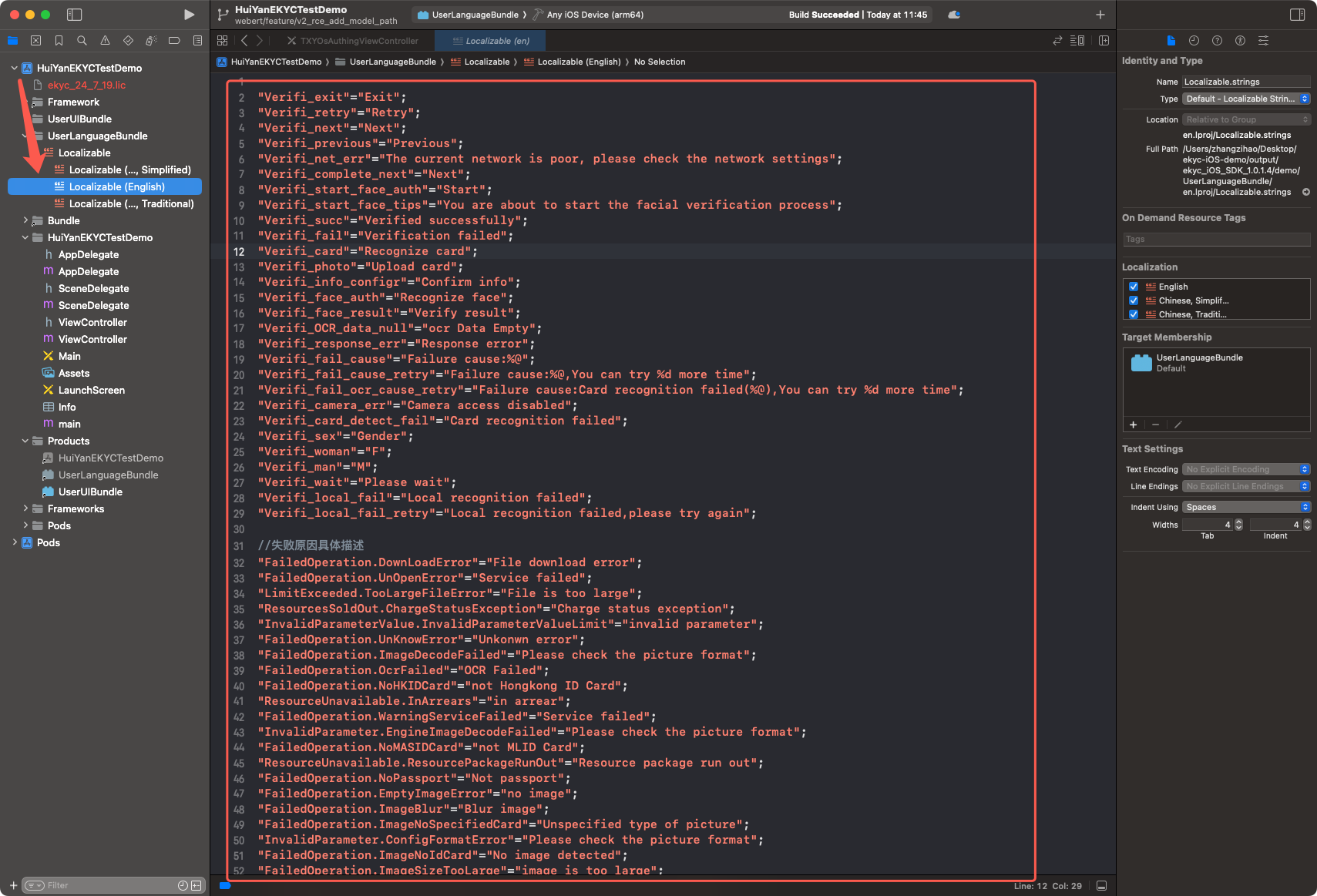 demo/ directory to find the project files, then locate the Localizable under the UserLanguageBundle directory; this part serves as the translation source file.