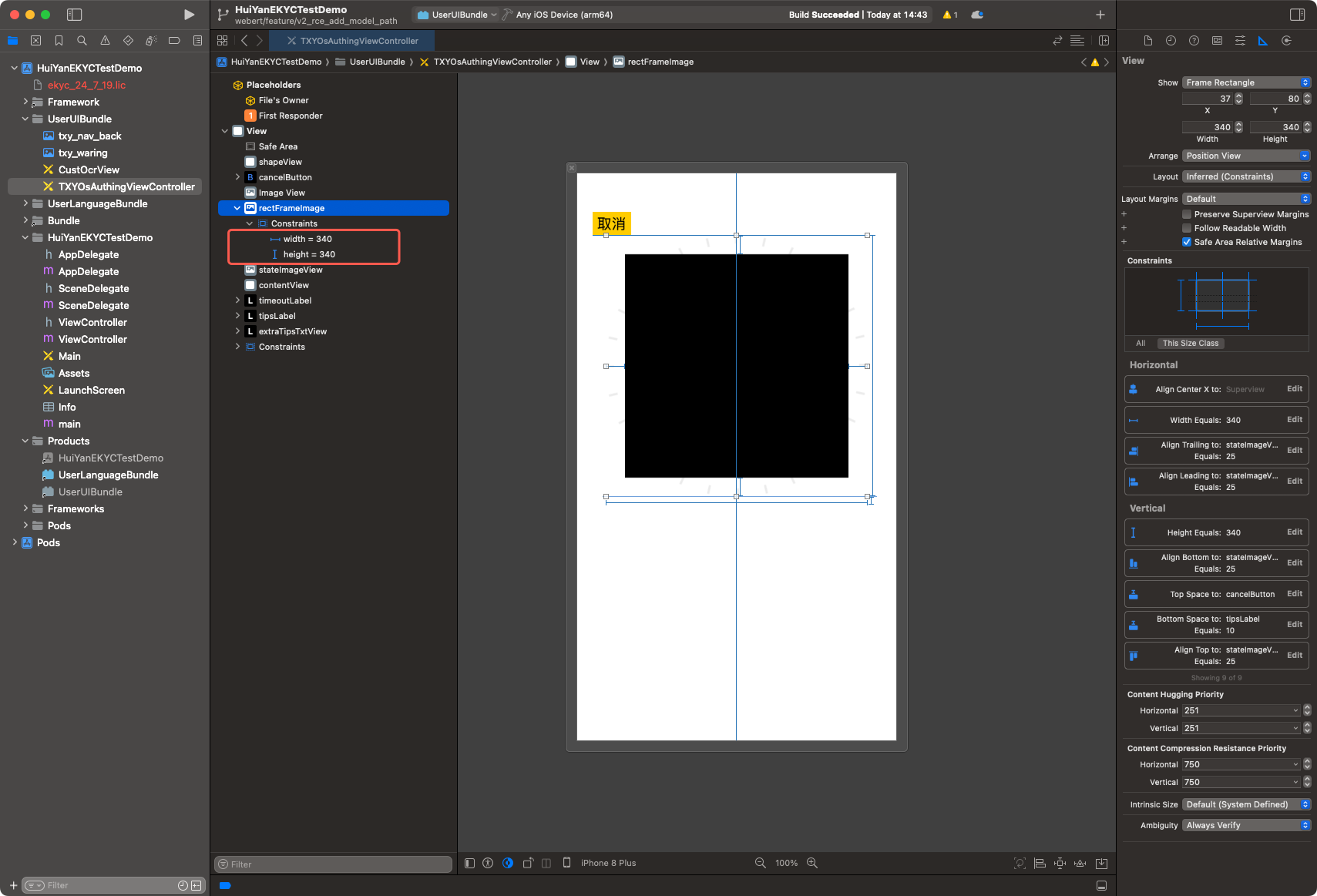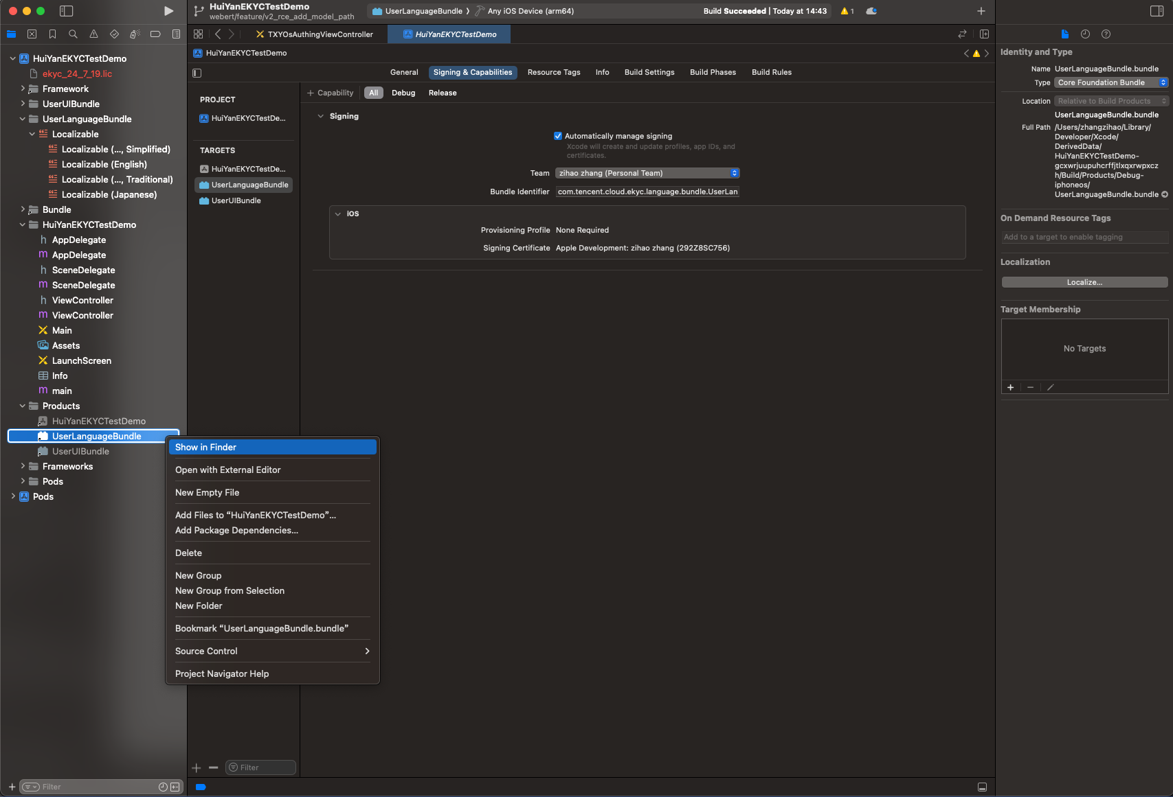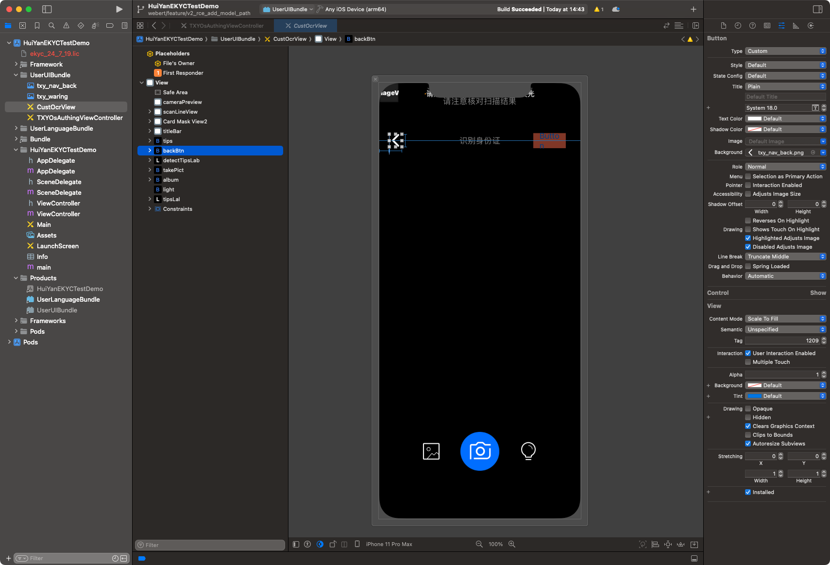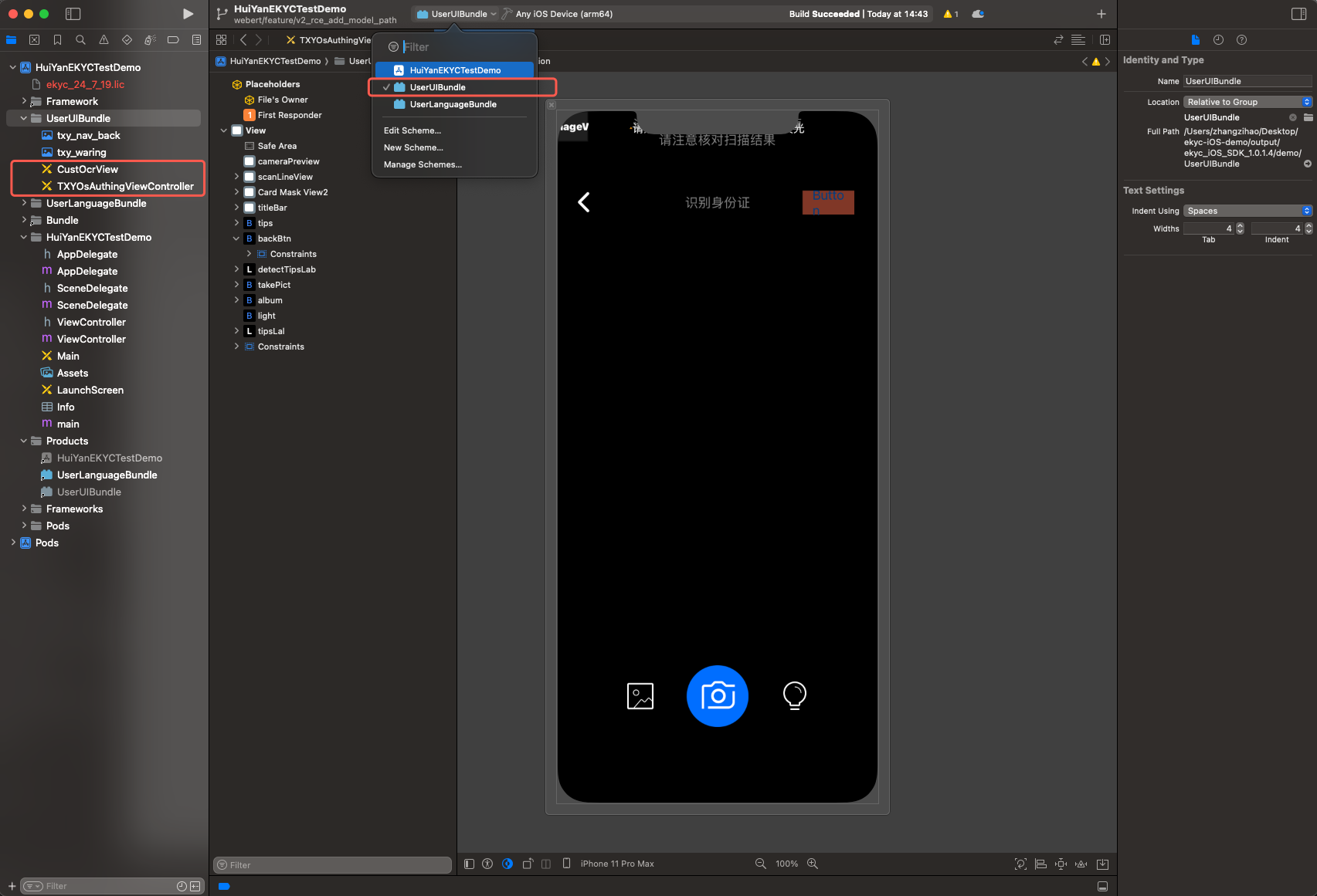 demo/ directory.UserUIBundle (Build Target) in the project.TXYOsAuthingViewController.xib or CustOcrView.xib as needed, or add new controls.UserUIBundle.bundle.Info.plist and _CodeSignature folders within the Bundle.UserUIBundle.bundle into the host project.VerificationConfig *config = [[VerificationConfig alloc] init];// Specify the absolute path to the custom UI Bundleconfig.userUIBundlePath = [[NSBundle mainBundle] pathForResource:@"UserUIBundle" ofType:@"bundle"];