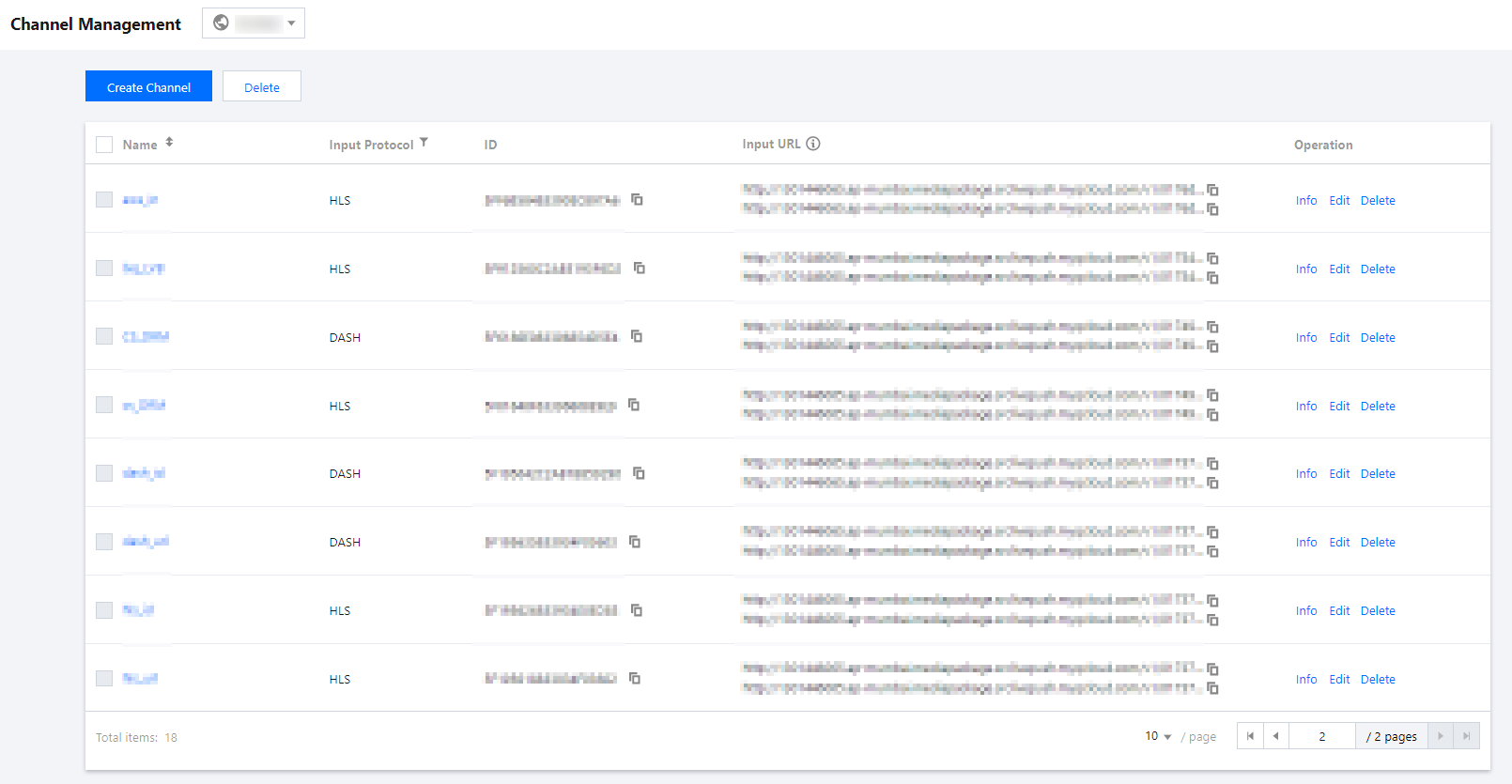 You can manage created channels on the Channel Management page. Click Info in the Operation column to view channel details. Click Edit to edit a channel, and click Delete to delete a channel. Note that you cannot delete a channel bound with endpoints. Delete the endpoints first before deleting a channel.