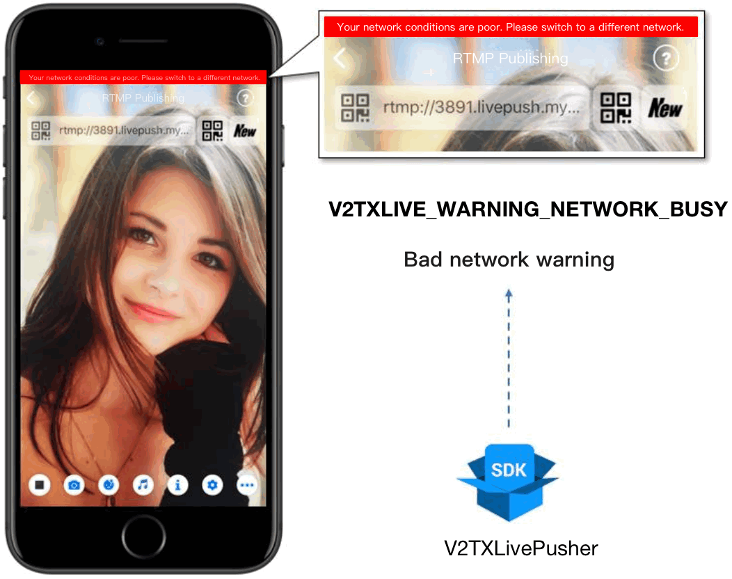 V2TXLivePusherObserver. The event indicates poor network conditions for hosts, which result in stuttering for audience. When this event occurs, you can send a UI message about poor network conditions to hosts, as shown above.@Overridepublic void onWarning(int code, String msg, Bundle extraInfo) {if (code == V2TXLiveCode.V2TXLIVE_WARNING_NETWORK_BUSY) {showNetBusyTips(); // Show a “network busy” message}}