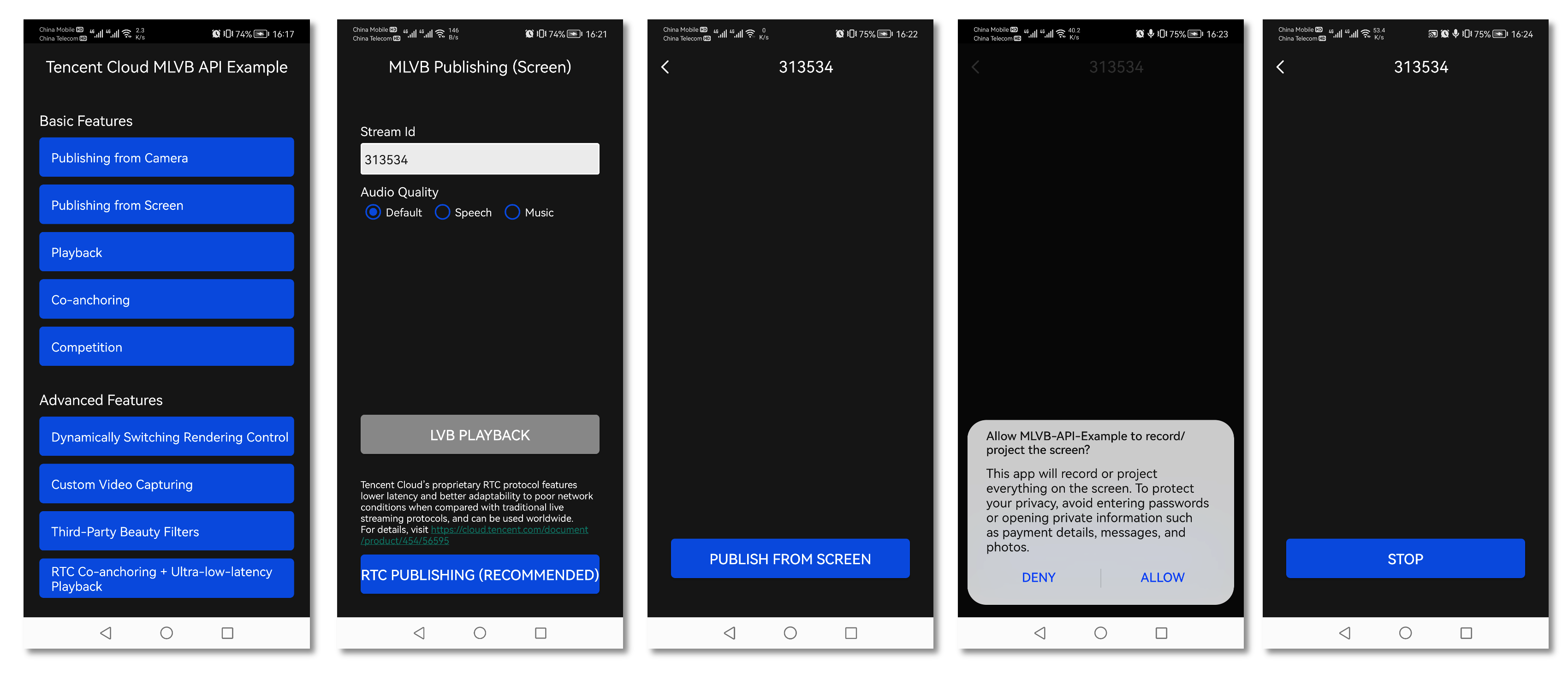 // The push stream can be started according to the push stream protocol. RTMP cannot connect to the microphone. It should use rtmp:// to connect to the microphone.String url = "rtmp://test.com/live/streamid?txSecret=xxxxx&txTime=xxxxxxxx";mLivePusher.startMicrophone();mLivePusher.startScreenCapture();int ret = mLivePusher.startPush(url);if (ret == V2TXLIVE_ERROR_INVALID_LICENSE) {Log.i(TAG, "startRTMPPush: license verification failed");}