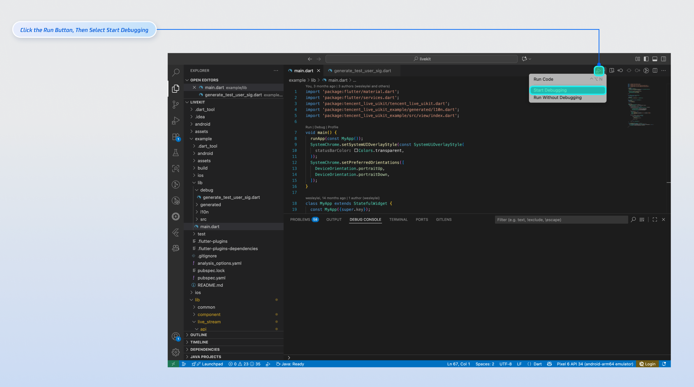 1. Configure SDKAppID and SDKSecretKey: In the livekit project, enter your SDKAppID and SDKSecretKey in the application/lib/debug/generate_test_user_sig.dart file:
