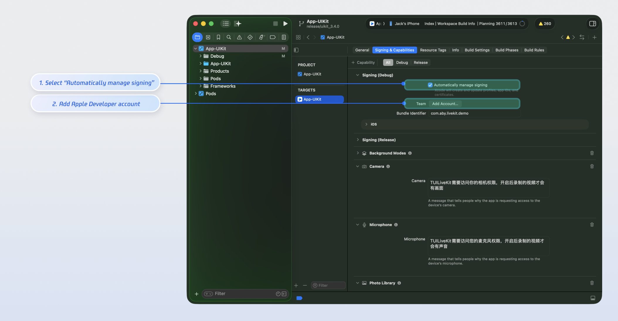 For production, generate the UserSig on your server. When a UserSig is required, your app should request a dynamic UserSig from your backend for authentication. See Generating UserSig on the Server for details. 2. Configure Apple Developer Signing: In the project's TARGETS under the Signing & Capabilities tab, select Automatically manage signing and configure your Apple Developer account and Bundle Identifier:
