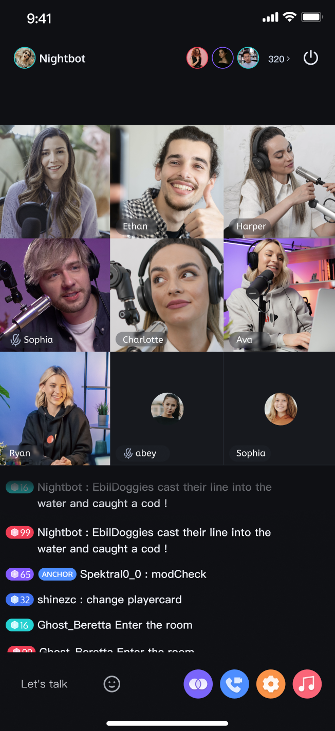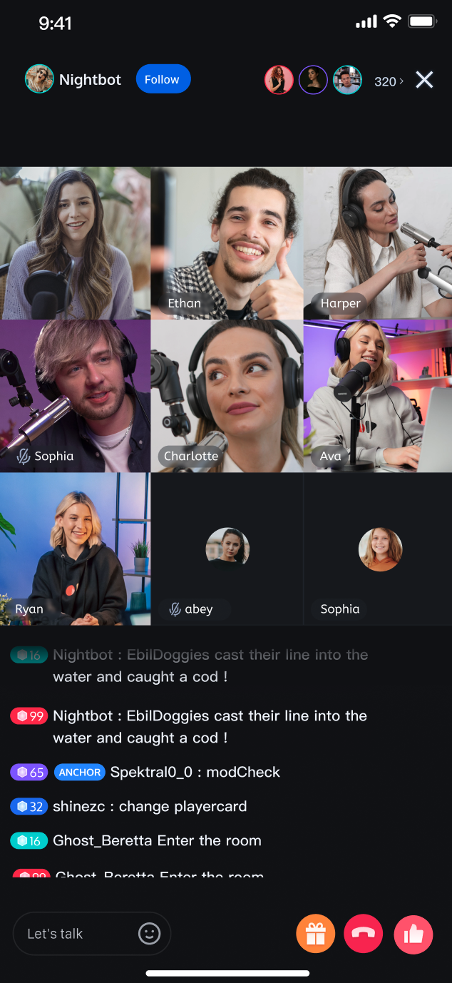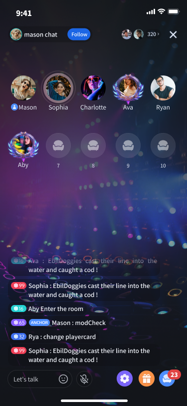 Voice Chat Room | Delivers ultra-clear audio quality, supports multi-user co-hosting, seat management, and real-time text chat—ideal for KTV, social, or gaming-themed rooms. | |