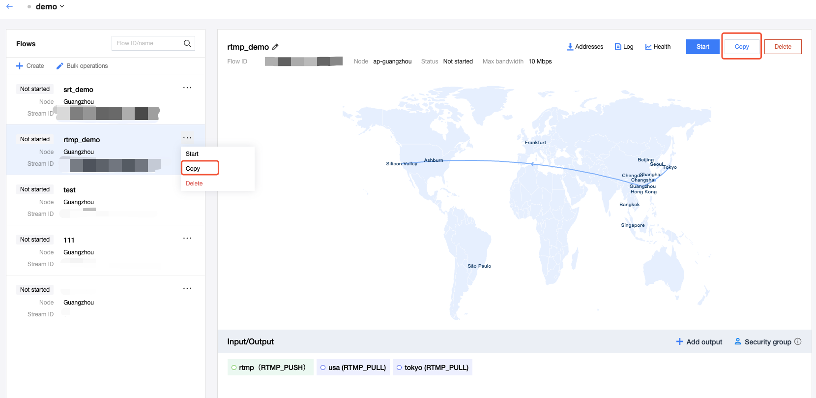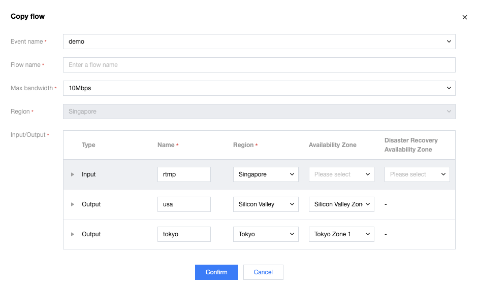 3. In the Copy function, you can reset the event name, flow name, max bandwidth, input name, input region, input availability zone, output name, output region, and output availability zone for the new flow. Other information cannot be modified and will be the same as the original flow by default.