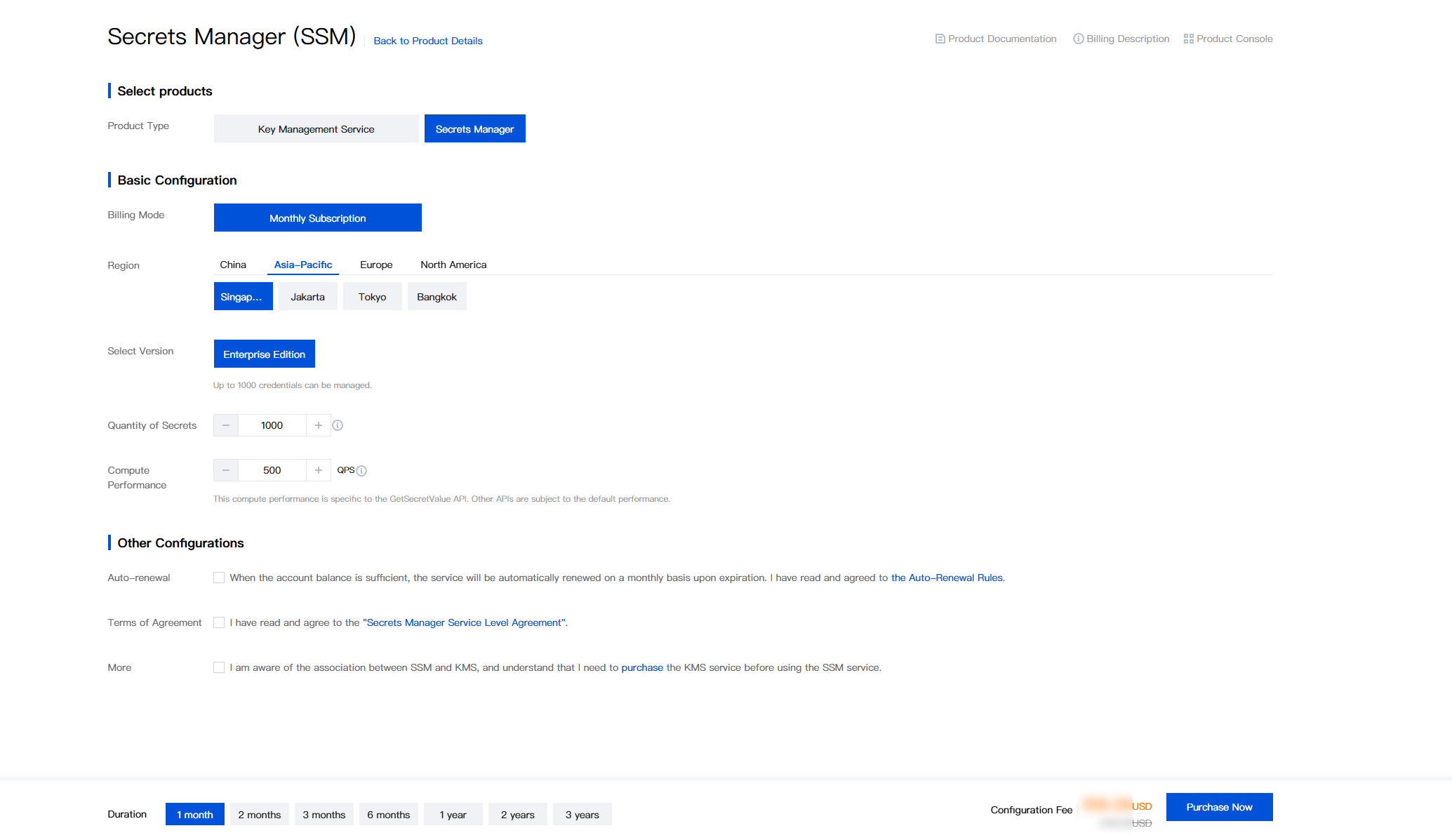 Choose region, quantity of secrest and compute performance on the purchase page. Read and select the related pricing description.
