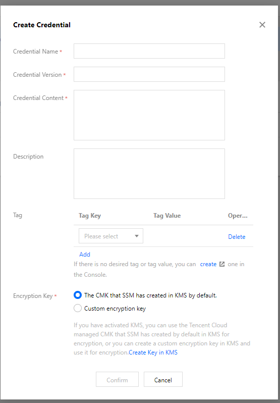 If you are using SSM, you have activated KMS. You can create an encryption key in either of the following ways: Use the default Tencent Cloud managed CMK created in the KMS console as the encryption key, and use the envelope encryption method for encrypted storage. Use a custom key created in the KMS console as the encryption key for encrypted storage.