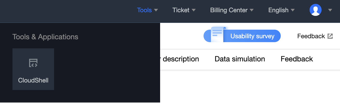 Log in to the CVM Console, select Tool > CloudShell at the top of the page to start CloudShell. As shown below: You can run CloudShell independently in the following ways: