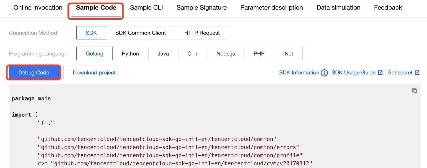 Enter API Explorer, select the corresponding API, and click debug code in the code example. As shown below: Note:
