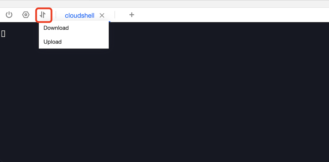 2. Select at the top of the CloudShell interface. As shown below: 3. Select Upload or Download to transmit files as needed.