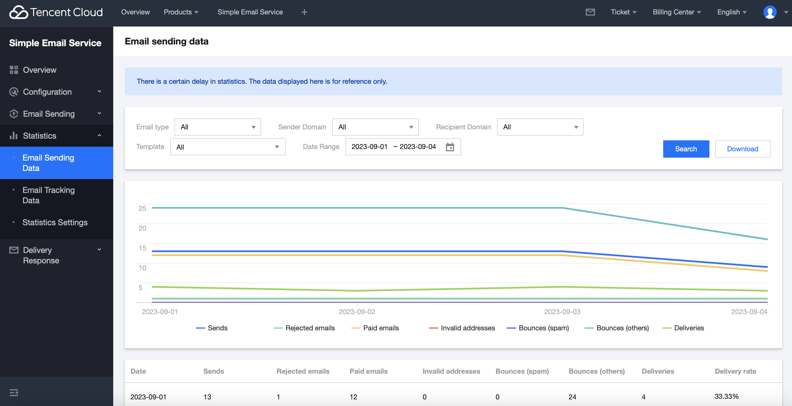 Log in to the Console > Statistics > Email Sending Data, which supports viewing and downloading email sending data from dimensions such as the sender domain, recipient domain, and template.