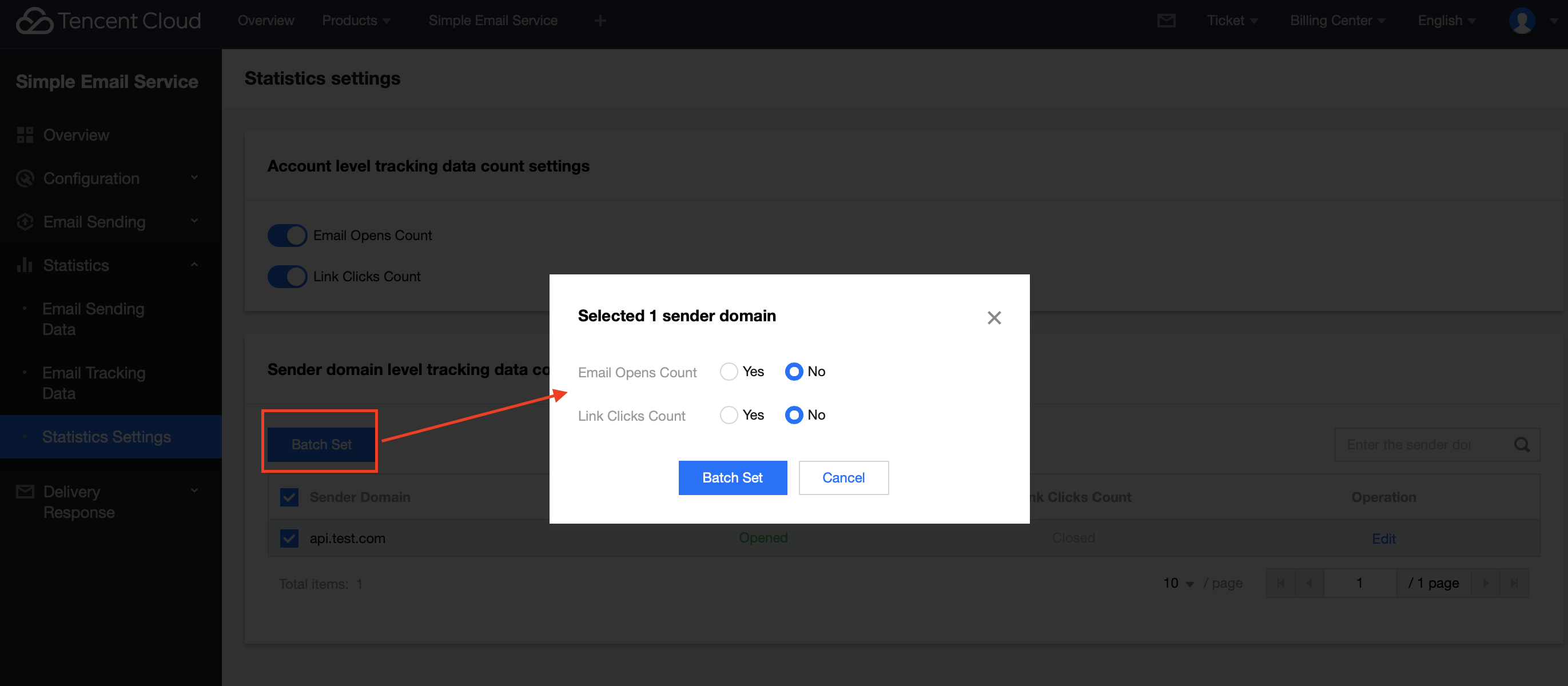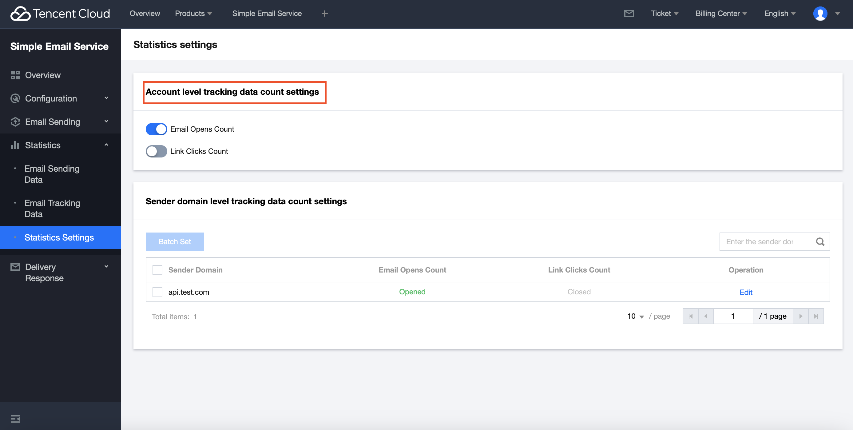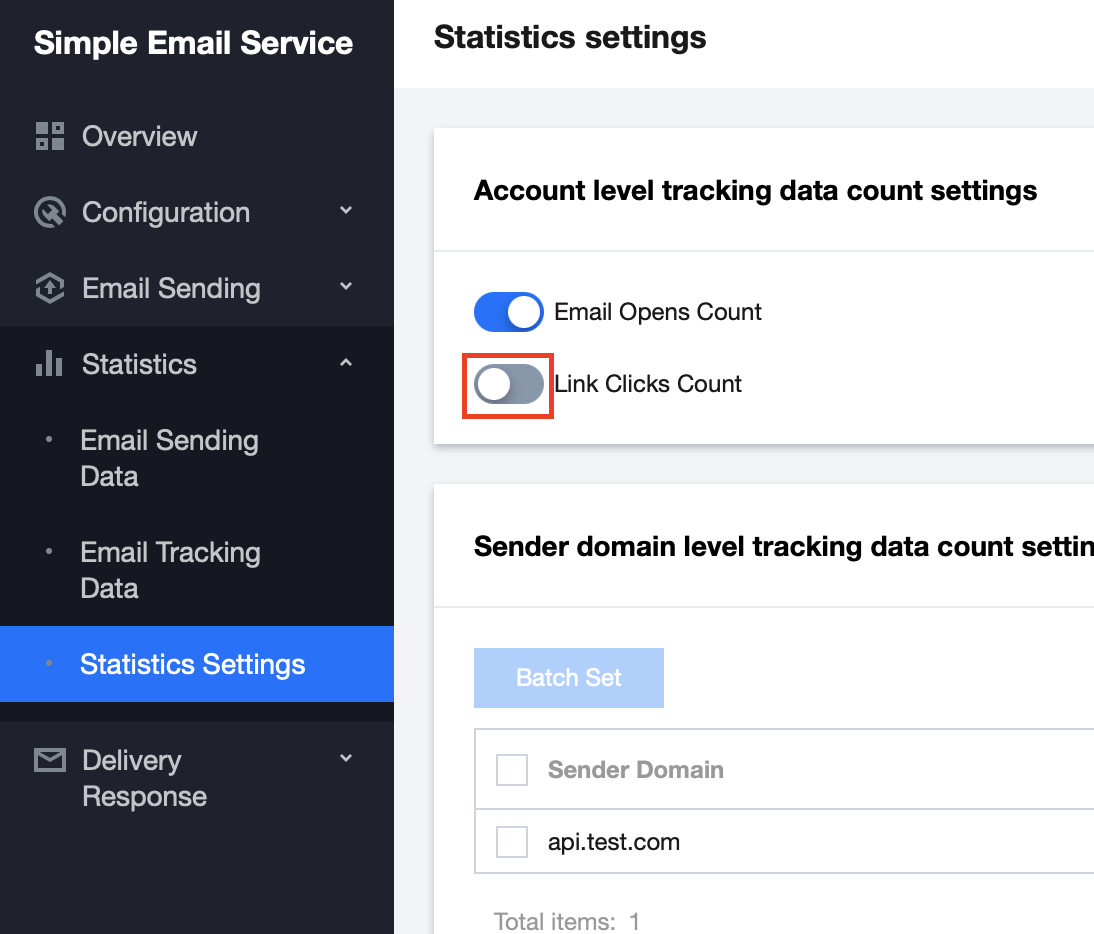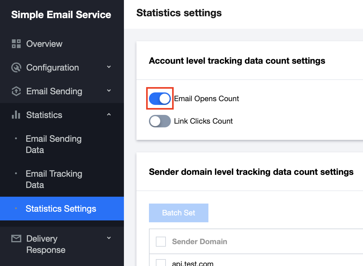 Log in to the Console > Statistics > Statistics Settings, which supports setting whether to enable the Email Opens Count and Link Clicks Count from both the account level and sender domain level dimensions. Directions