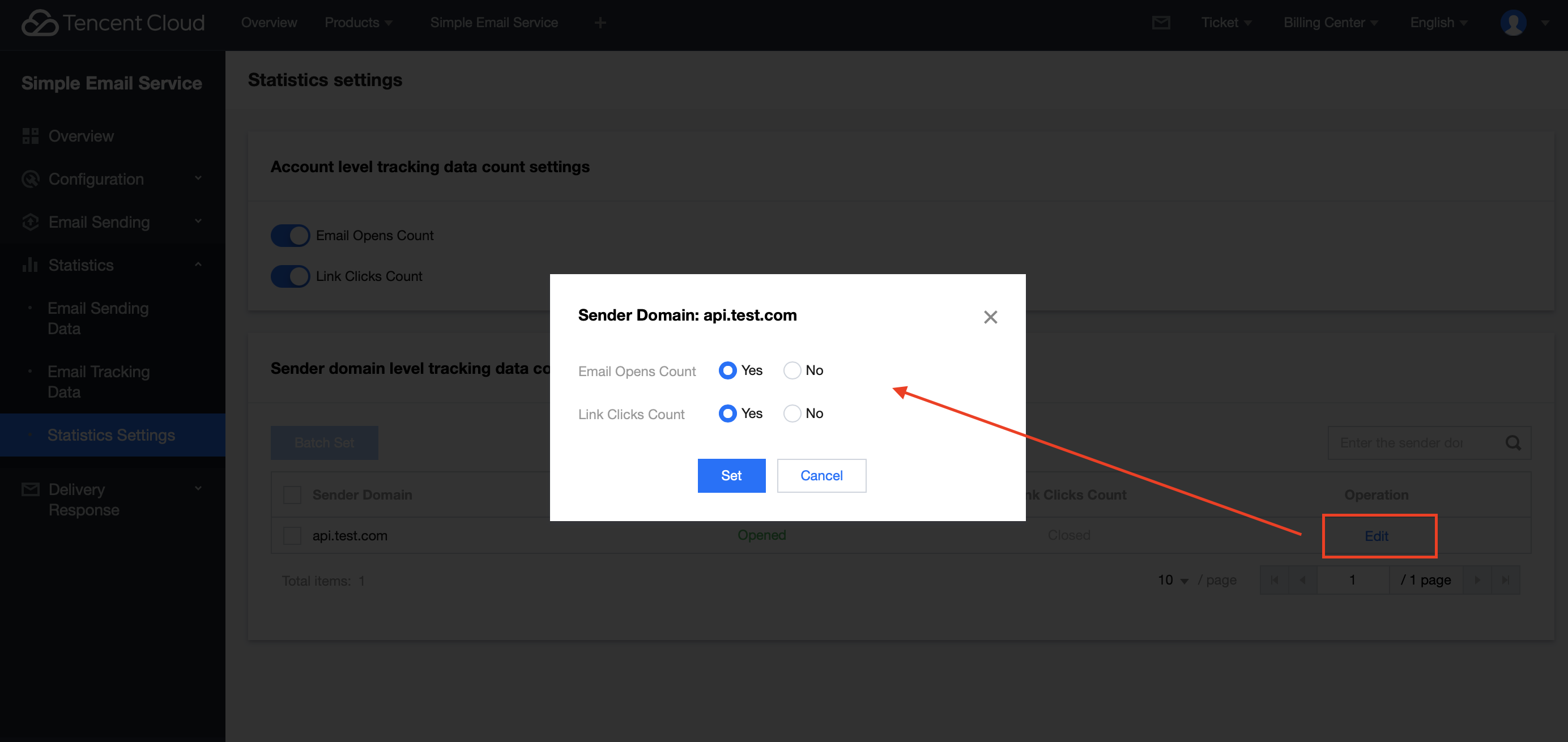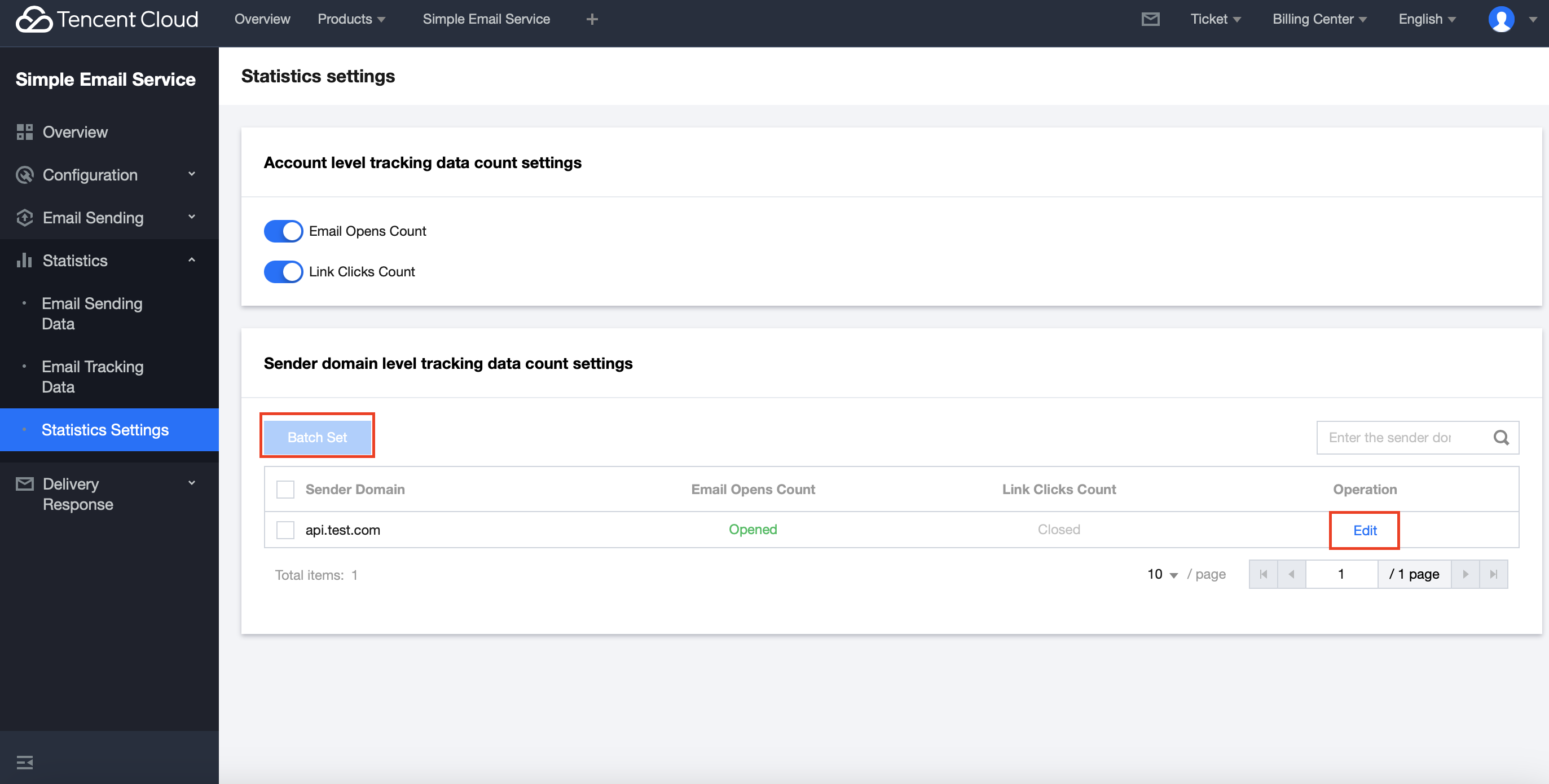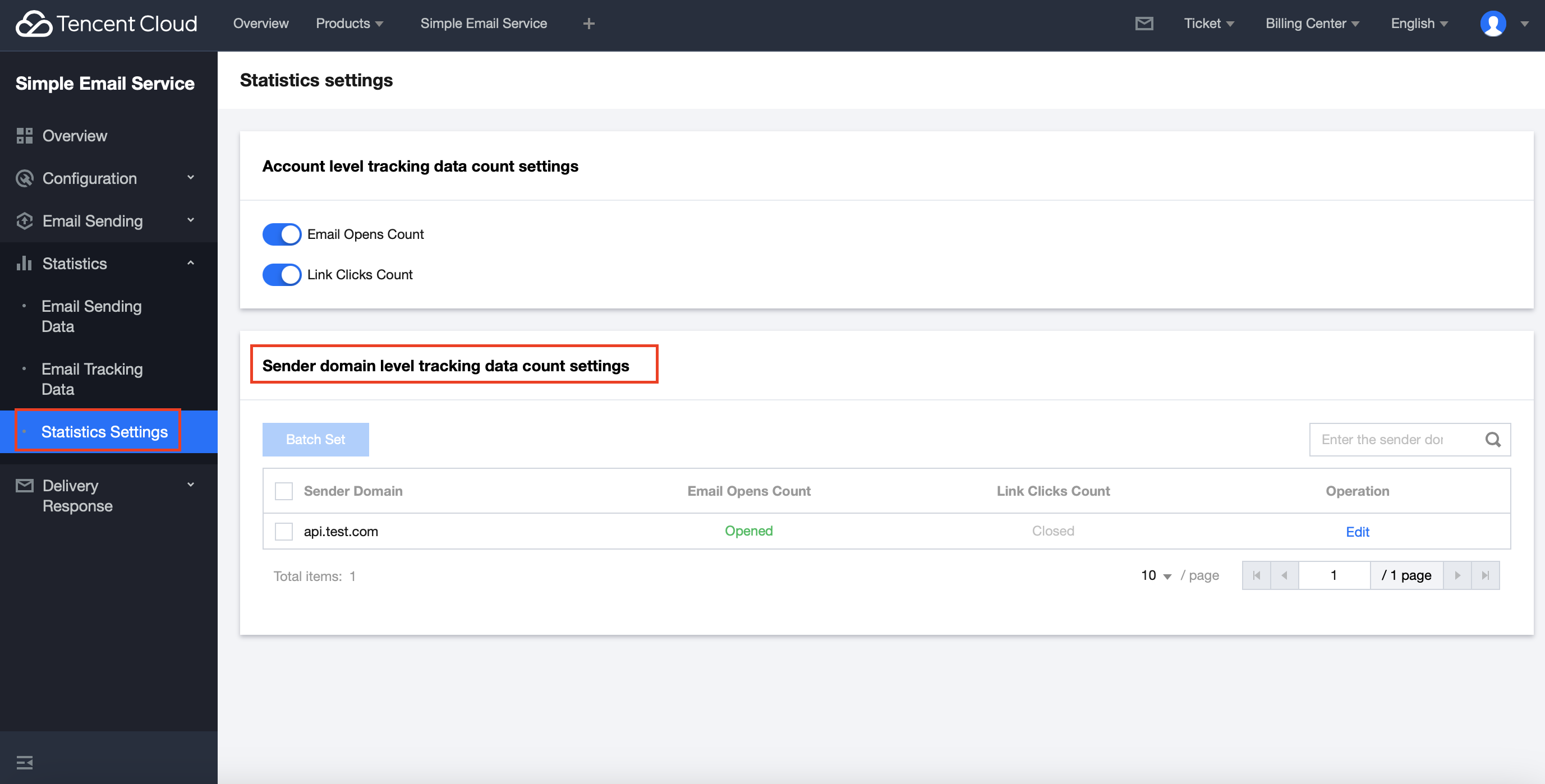 Log in to the Console > Statistics > Statistics Settings, which supports setting whether to enable the Email Opens Count and Link Clicks Count from both the account level and sender domain level dimensions. Directions