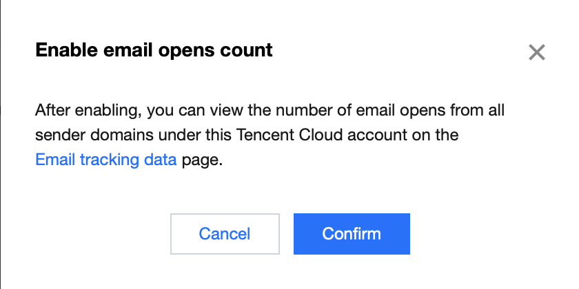 2. Click the switch for Email Opens Count, and confirm the operation a second time. After clicking "Confirm", you can enable or disable the "number of email opens" statistical capability for all sender domains under the account.