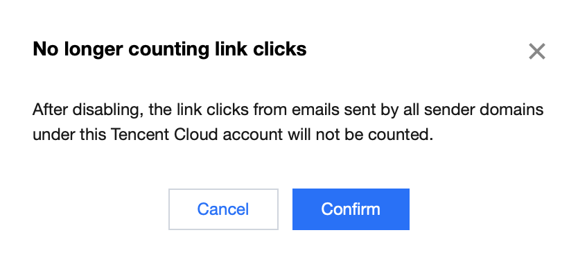 3. Click the switch for Sender domain level tracking data count settings, and confirm the operation a second time. After clicking "Confirm", you can enable or disable the "number of link clicks" statistical capability for all sender domains under the account.