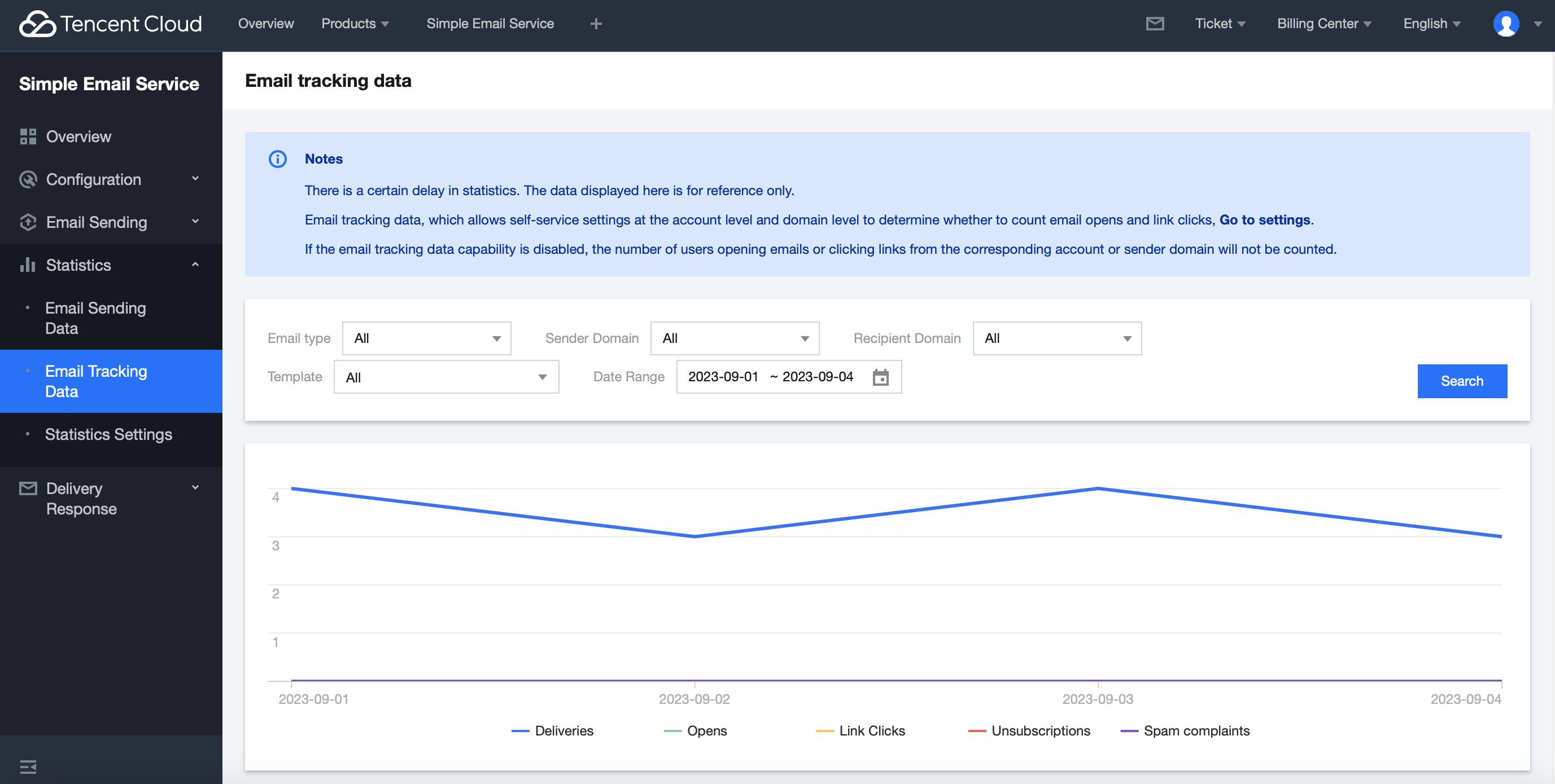 Log in to the Console > Email tracking data page, specify the sender domain, recipient domain or template to accurately filter and view the number of users who opened the email, clicked on links, unsubscribed, and reported spam data for a specific time period. Note: