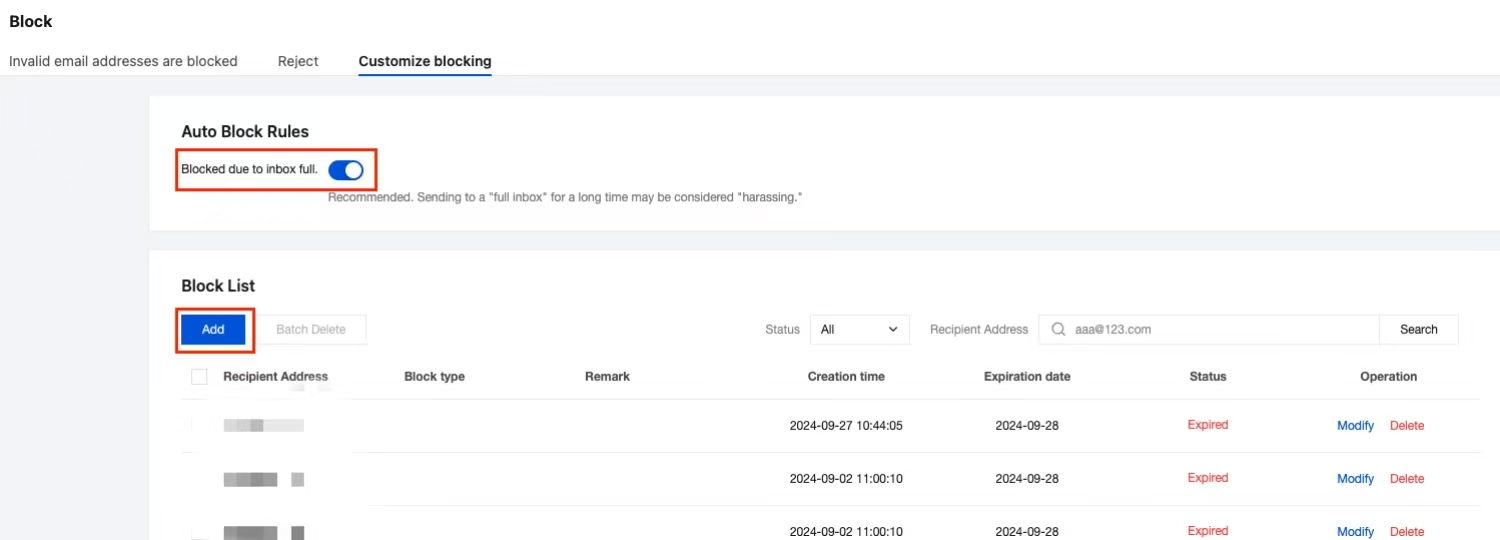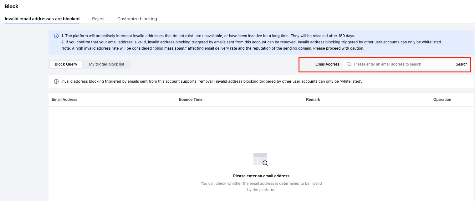 Remove: If an address blocked due to emails sent from your account is verified as valid, you can directly remove it from the blocklist.