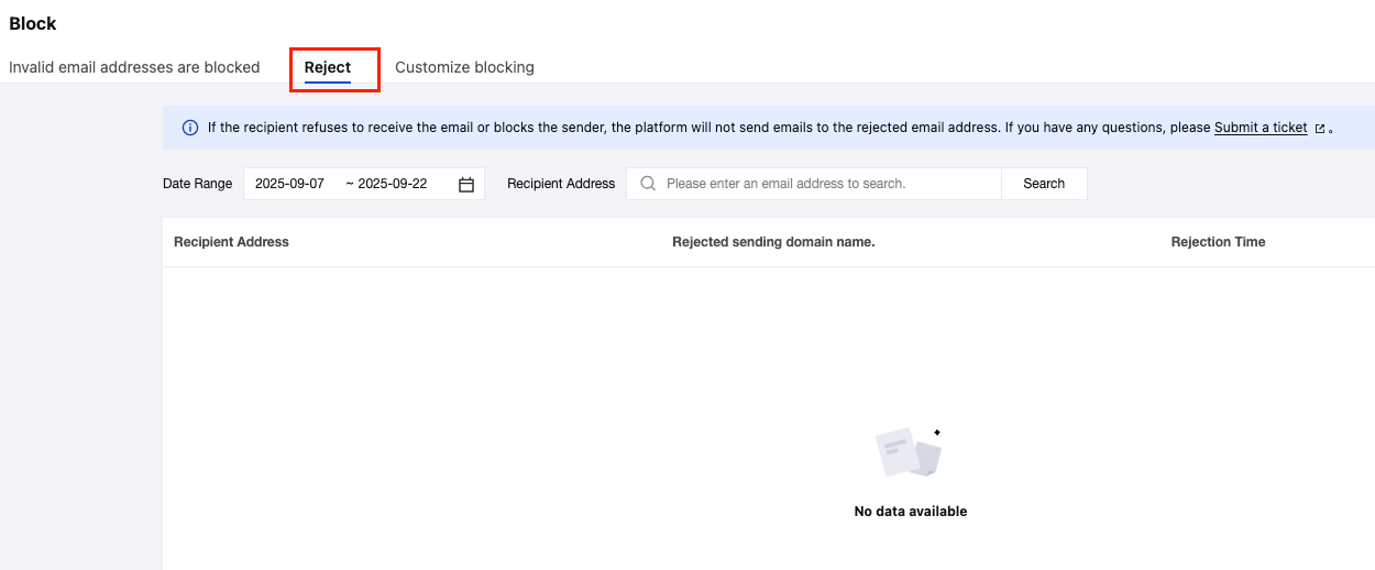 The Blocking module (SES Console>Delivery Response>Blocklist) allows you to view detailed blocking information from the perspective of recipient email addresses, including reasons and timestamps. Invalid Address Blocking