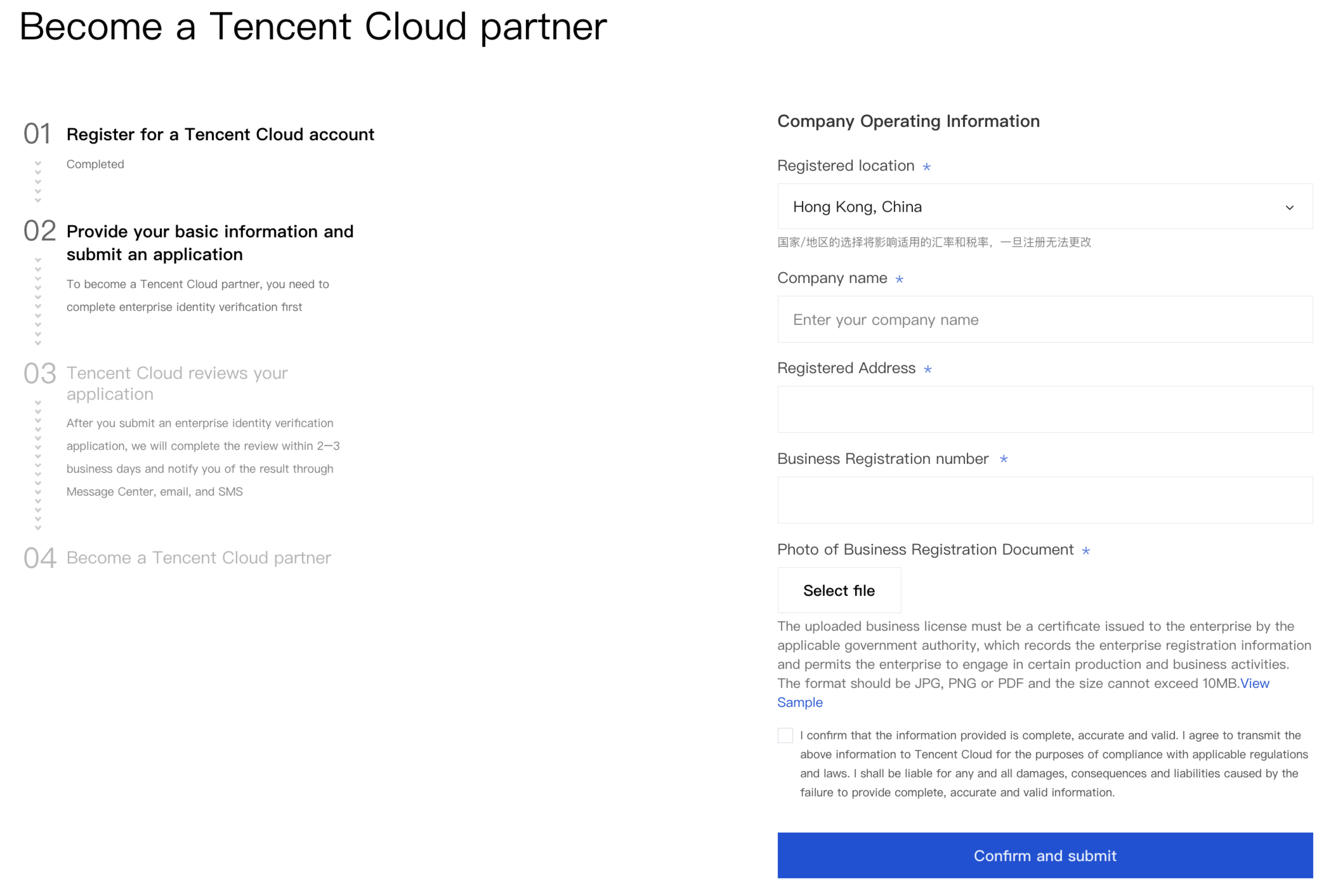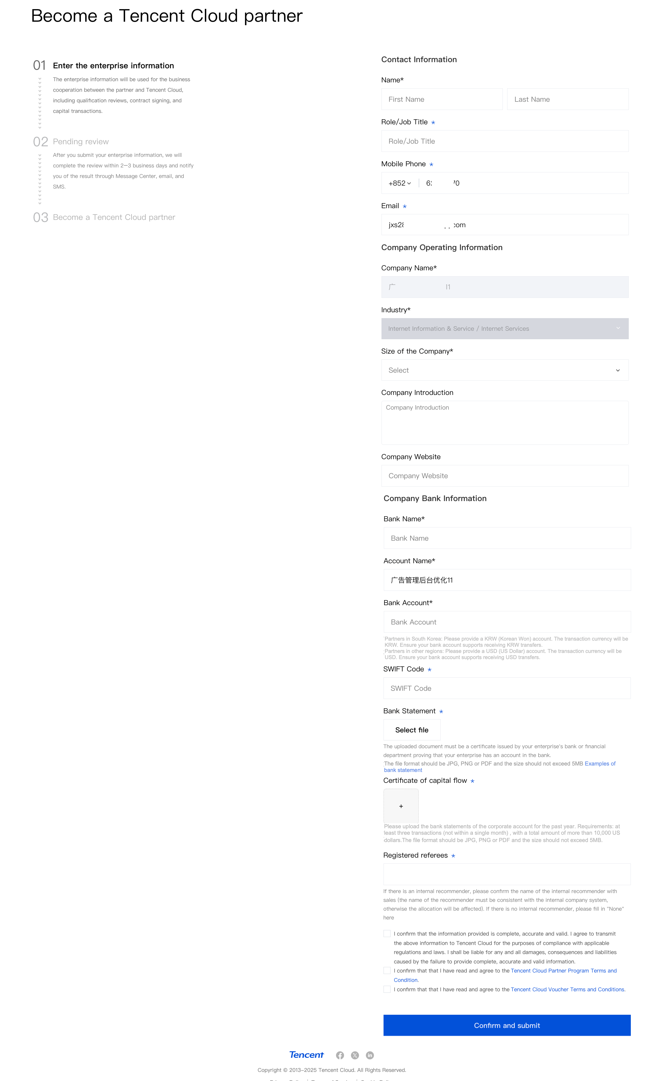 1. Enter the reseller qualification application page, fill in company information as required, including company contact information, operational information, bank account information, and upload valid bank account opening proof documents.
