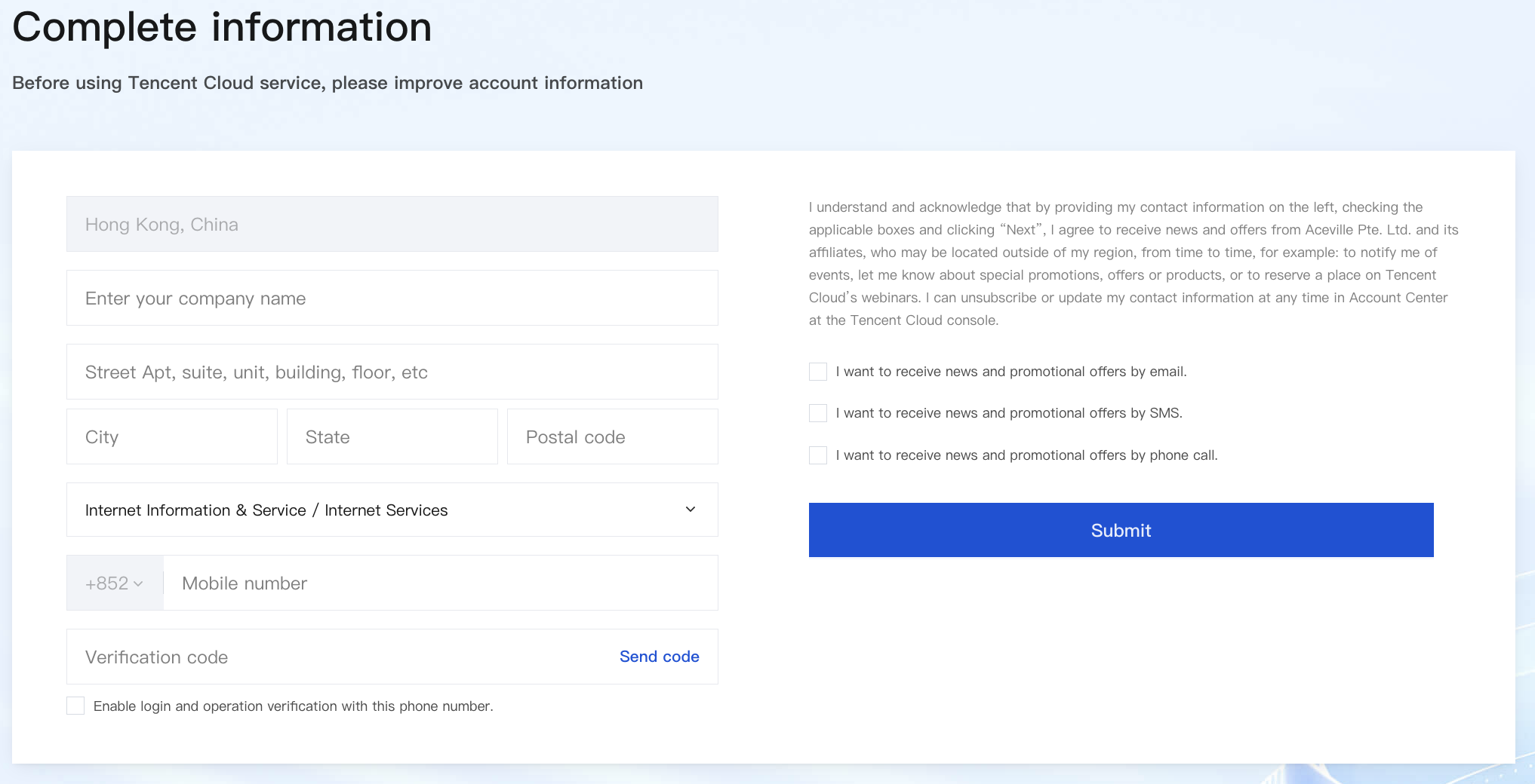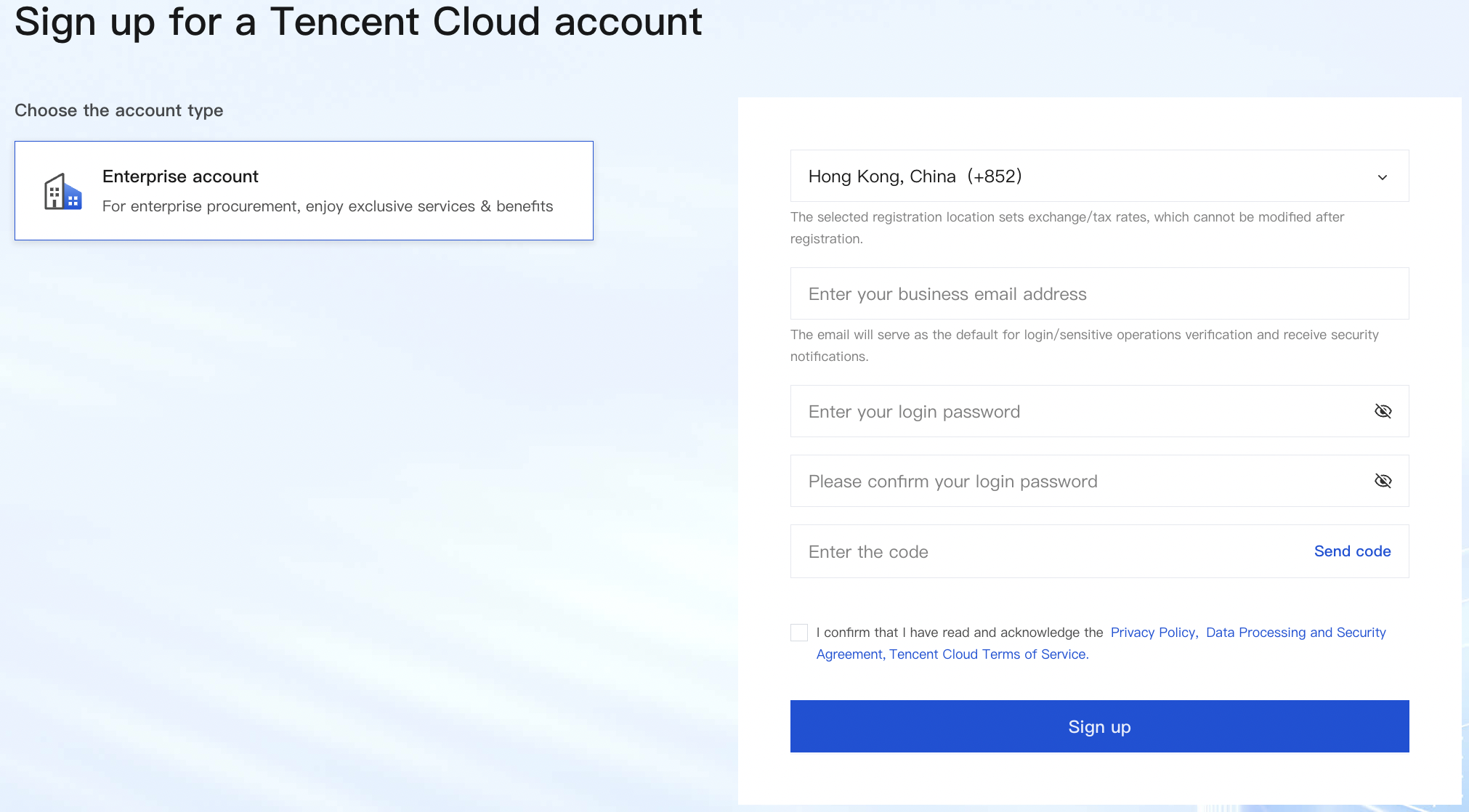 3. Enter the registration page and fill in the business account registration information. For related information, see Register Tencent Cloud - Email Registration.