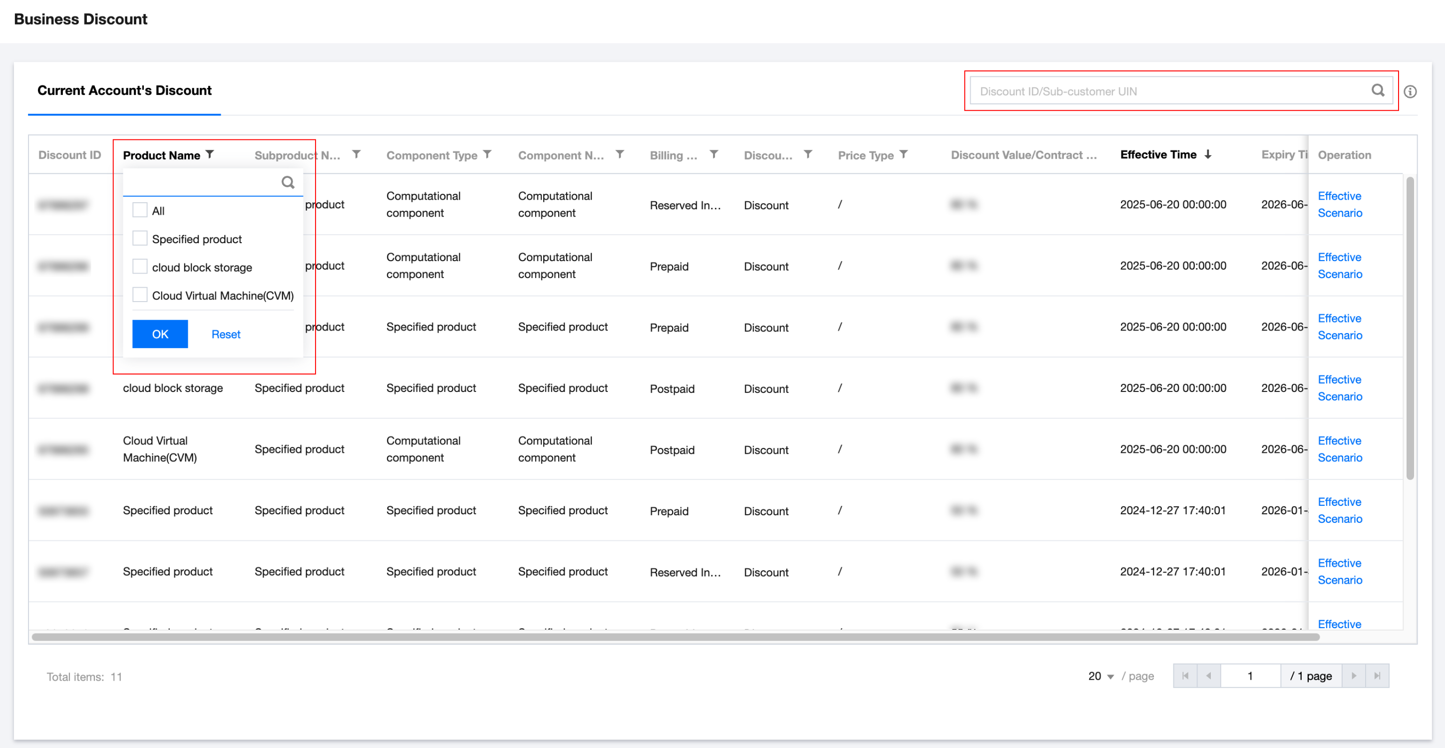 product name, subproduct name, component type, component name columns display as "specified product" for policy discount. Click the funnel icon on the right of the column name, check "specified product" to view related discount information.