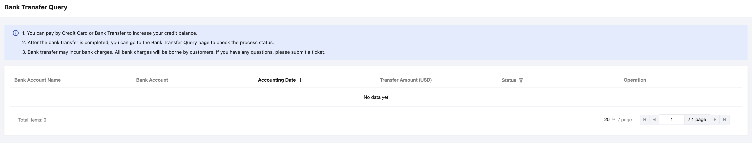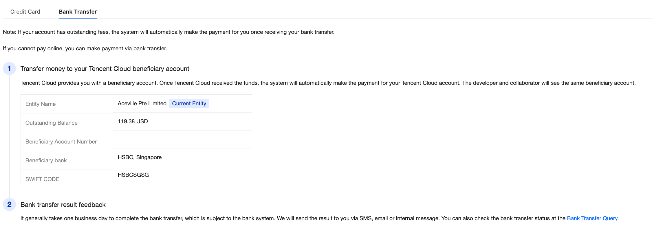 2. Enter the Billing Center > Fund Management > Payment > Bank Transfer webpage. 3. Query and enable the bank transfer beneficiary account.