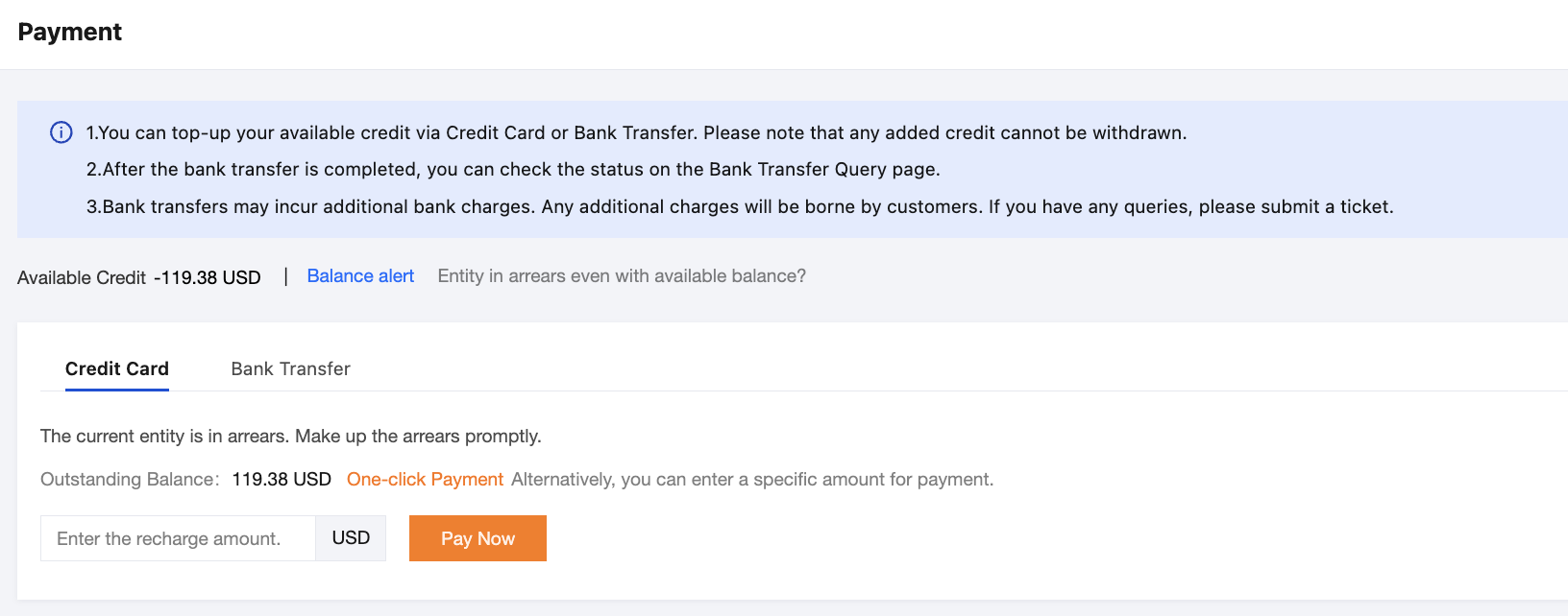 1. Log in to the console and go to Billing Center > Payment Management > Payment. Enter the top-up amount and payment account information and click Pay Now. Note: