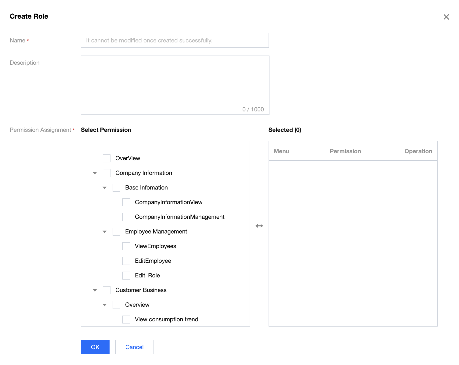 4. Set the basic info of the role and select the permission to be allocated by menu level.