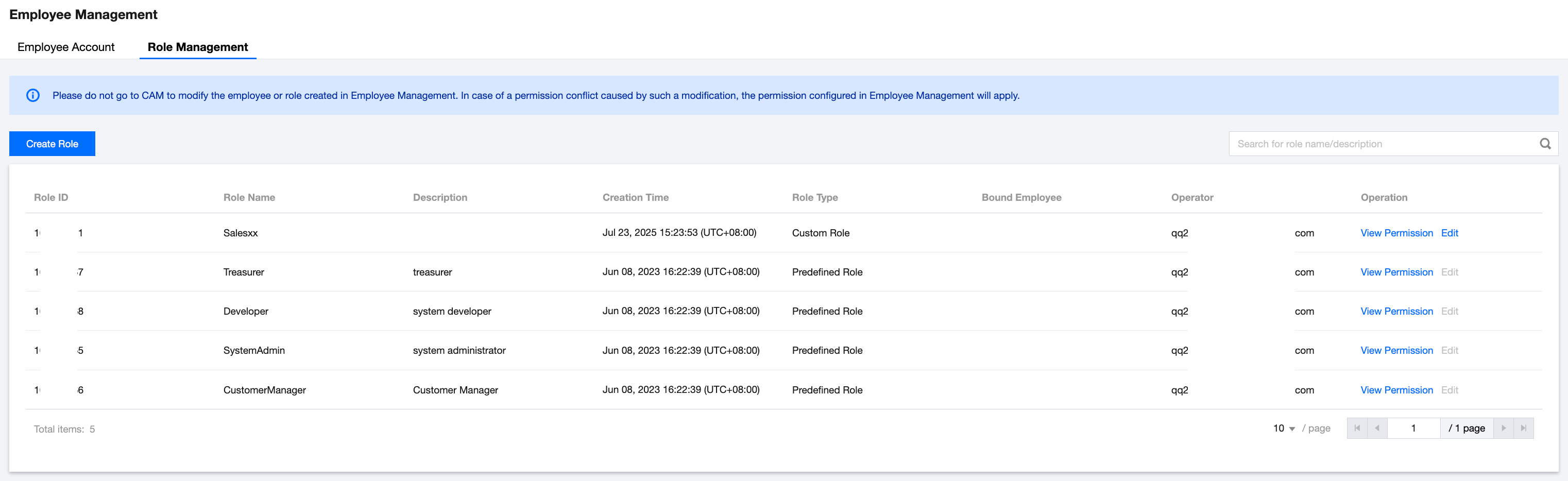 You can use a partner account to enter the Employee Management > Role Management page to view system preset roles. When allocating roles to employees, you can select from the preset roles and permissions provided by the system. Preset Role List