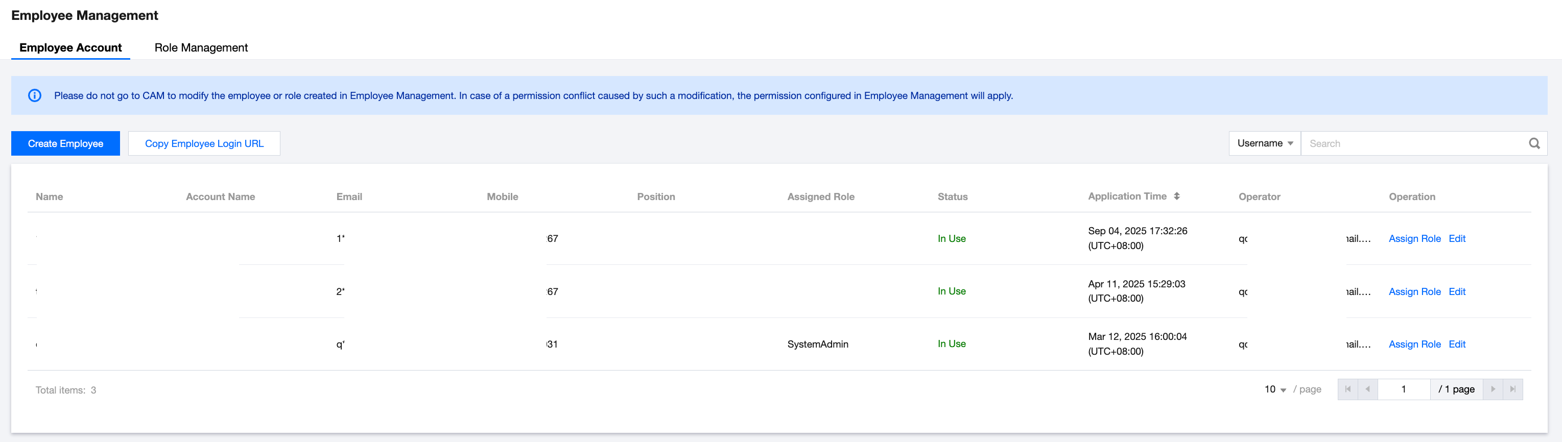 Note: If an employee's sub-account is Activated but employee information is not entered, you must complete and assign roles to the employee information before the sub-account can continue to use (the employee account name must match the sub-account name). Meanwhile, you need to revoke the authorized permissions of the employee's sub-account to avoid data inconsistency with the decentralized management of the partner center.