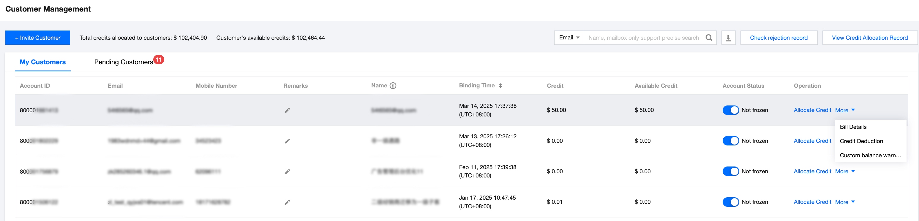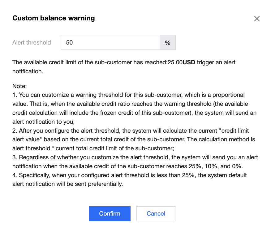 Regardless of whether a custom alert threshold is set, the system will send you an alert notification when the available credit limit of the sub-customer reaches 25%, 10%, or 0%.