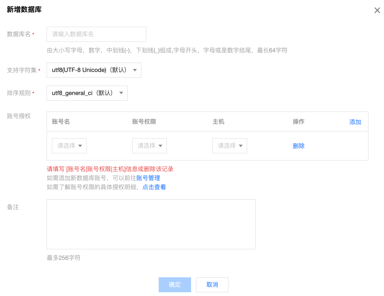 备注 | 为新建的数据库备注。最多支持输入256个字符。 |