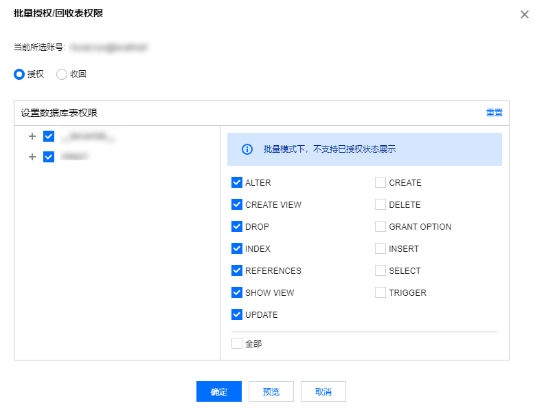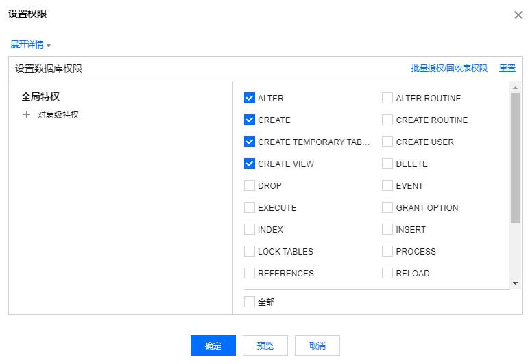DROP | 删除数据库、表、视图、存储过程、函数等对象的权限。 |