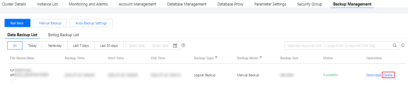 3. On the cluster management page, select the Backup Management tab, select the data or log backup list, find the target backup file, and click Delete in the Operation column.