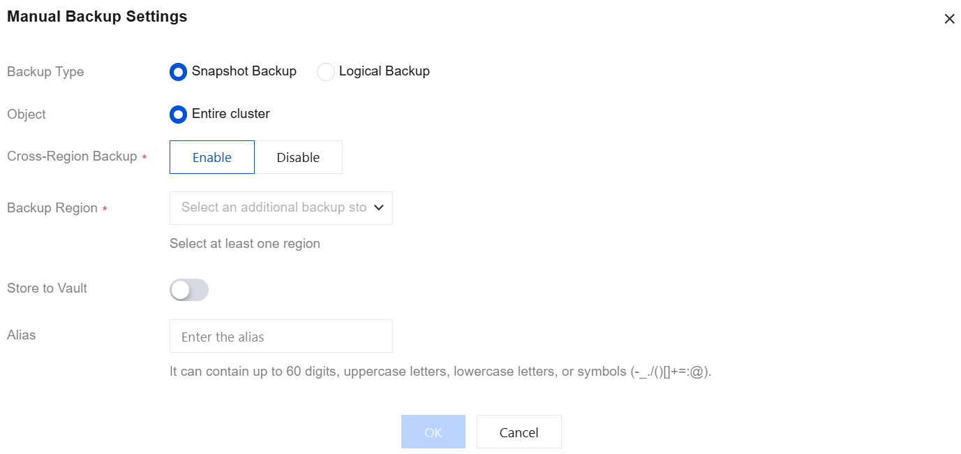 Alias | When you create a manual backup, you can set an alias for the backup file. The alias can contain only digits, uppercase and lowercase letters, Chinese characters, and special characters (-_./()[]()+=:;@), with a maximum length of 60 digits. |