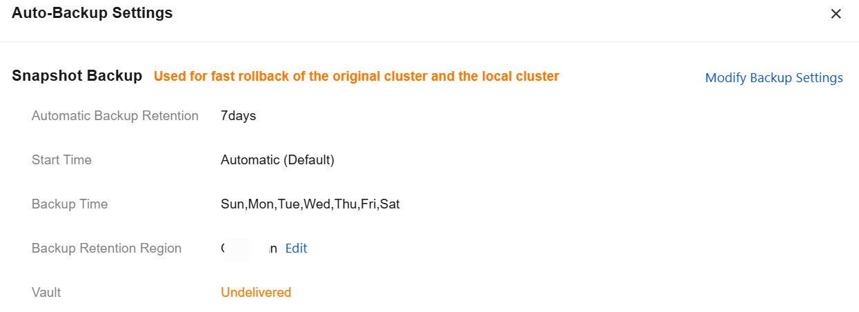 Under Snapshot Backup, you can view the current configuration policy of the cluster. Click Modify Backup Settings to make changes. The configurations and their descriptions are listed in the following table.