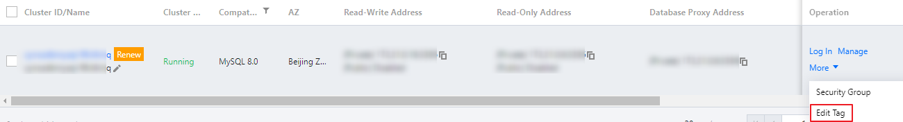2. Select a region at the top of the page, select More > Edit Tag in the Operation column of the target cluster in the cluster list.